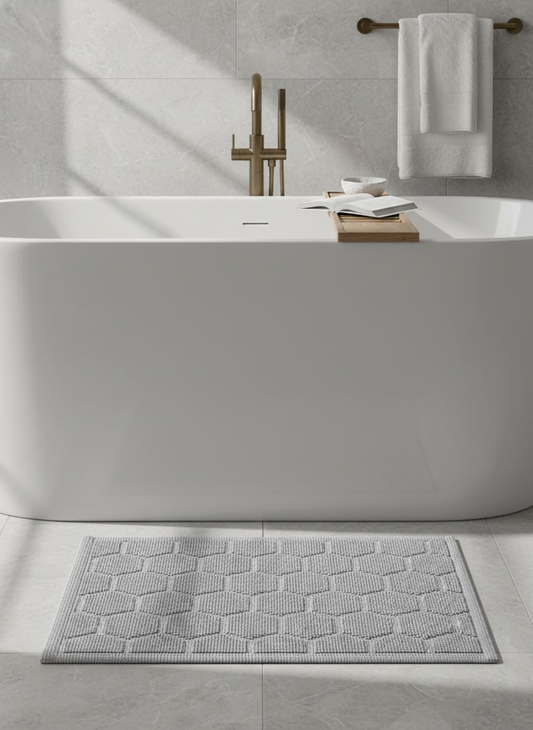Pensé dans un format intime, le tapis de 50x80 cm délimite une zone pratique devant vasque ou baignoire, offrant un point d’ancrage visuel qui organise l’espace. Sa taille compacte permet de l’intégrer aussi bien dans une salle d’eau réduite que pour renforcer un coin détente dans une chambre minimaliste, sans imposer sa présence.