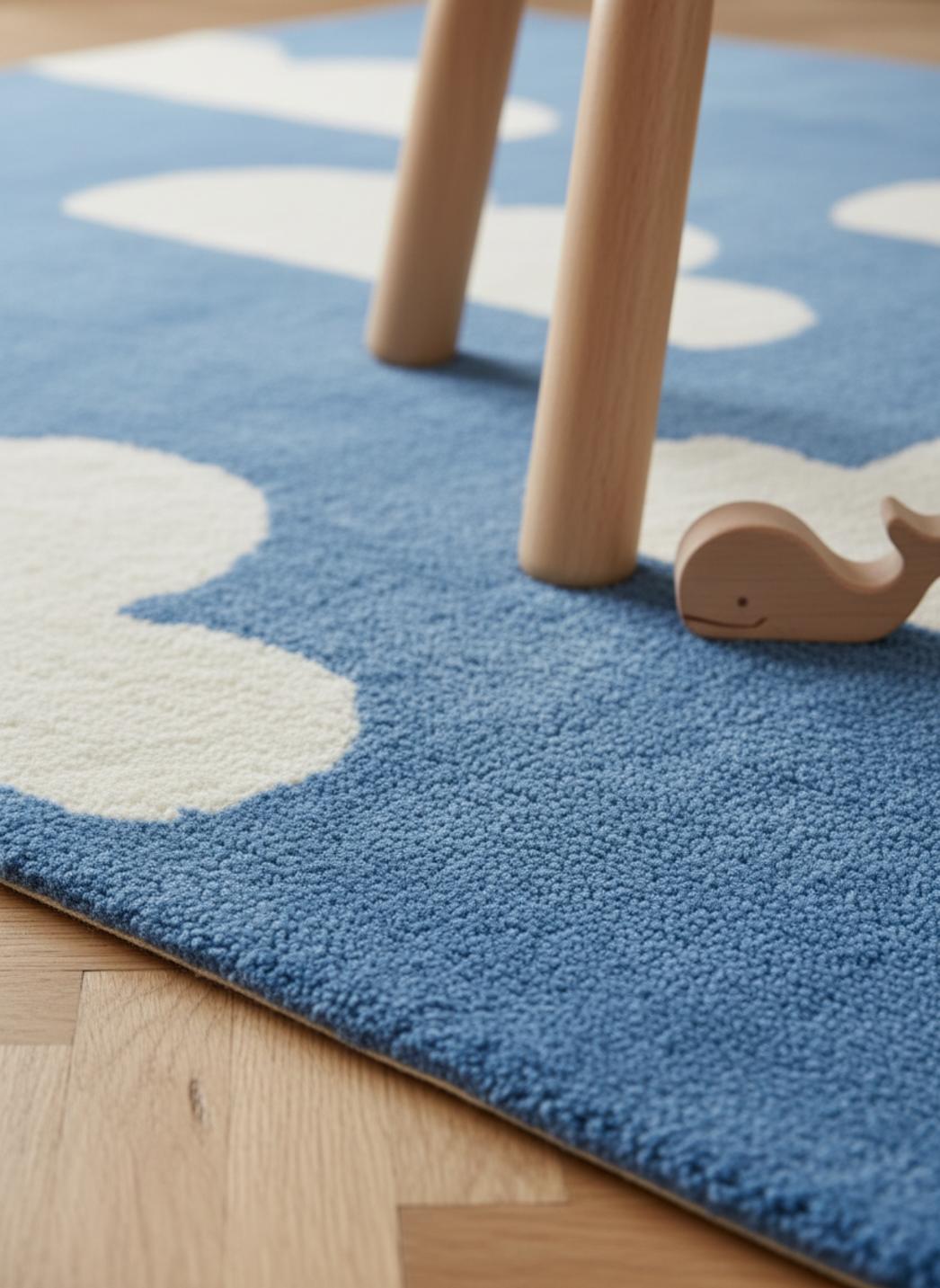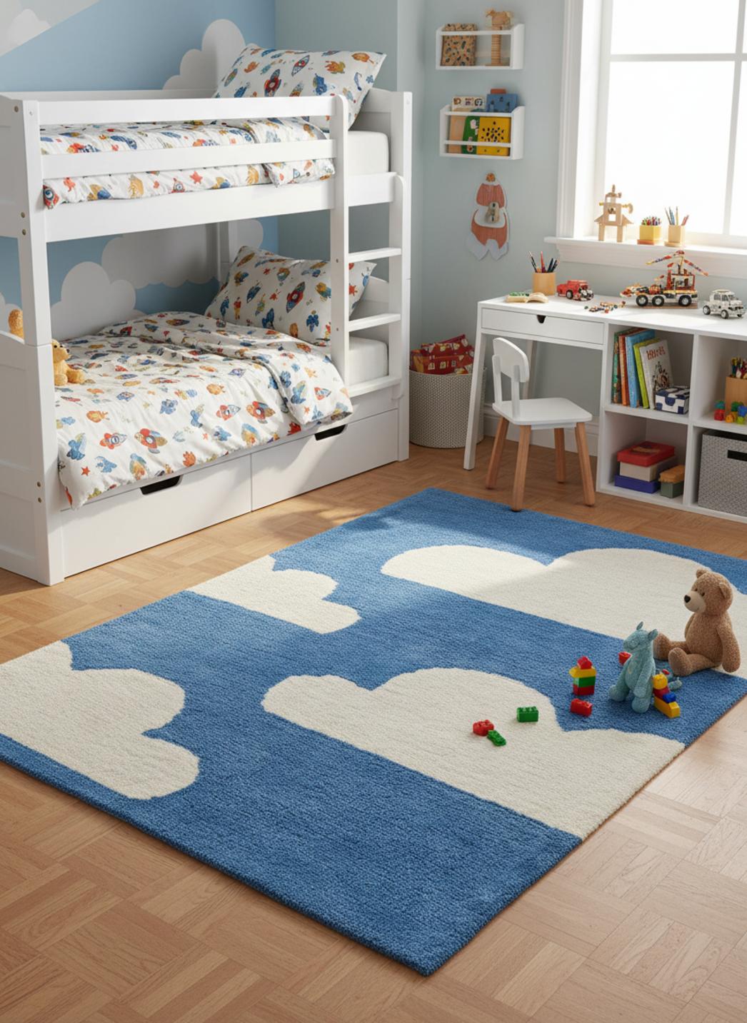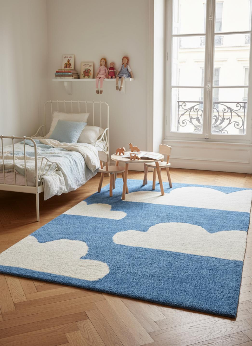Imaginez un coin où chaque histoire commence au sol, où les rires se posent doucement sur une surface qui rappelle la caresse d’un ciel doux : un tapis au motif de nuage qui invite à la rêverie. Vous y installez un coussin, un doudou, et laissez la lecture du soir se transformer en voyage paisible, tandis que les couleurs apaisantes apportent une atmosphère enveloppante à la chambre.
