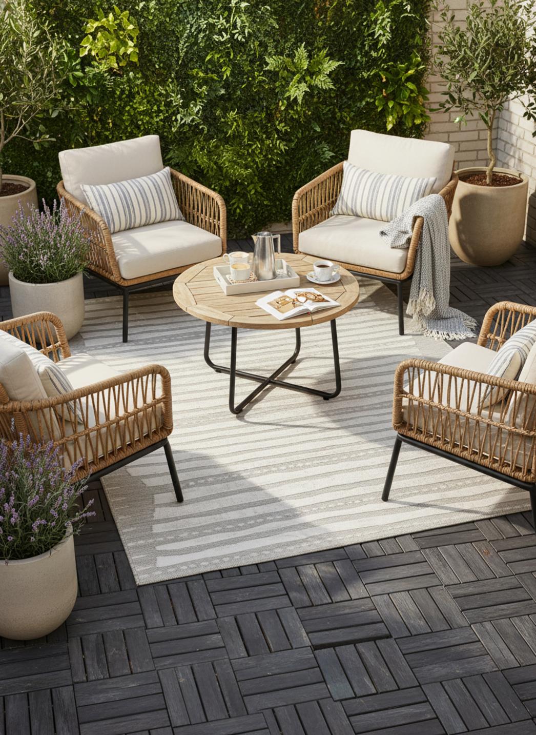 Dans la lumière délicate d’un matin d’été, les fines lignes de ce tapis moderne strillé gris se dessinent avec une élégance tranquille. Son relief discret joue avec les ombres et la clarté du jour, apportant une texture subtile aux sols extérieurs. Le gris, dans toute sa nuance, diffuse une impression de calme et d’équilibre, idéale pour habiller un balcon, un petit espace lounge ou un coin repas intime. Par son format 80x150 cm, il trouve naturellement sa place dans les zones plus restreintes, où il structure sans alourdir, créant une continuité visuelle raffinée. Les stries apportent un rythme doux, presque graphique, qui s’accorde parfaitement avec les lignes d’un mobilier contemporain ou les matières brutes comme le bois et la pierre. Ce tapis gris capte la lumière du soleil et la restitue dans un jeu de contrastes feutrés, donnant vie à l’espace extérieur. À la fois sobre et expressif, il invite à la détente et à la sérénité, comme un fragment de modernité posé dans un décor apaisé. Une pièce qui transforme chaque coin de terrasse en un lieu de douceur, simple et plein de justesse.