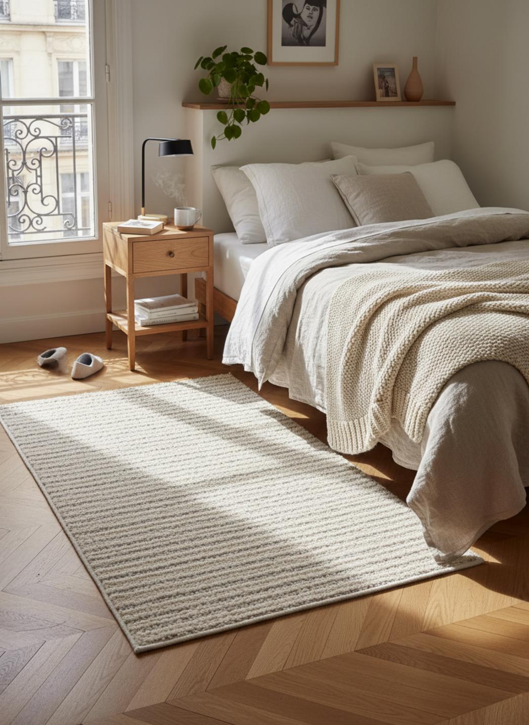 Sa mise en scène privilégie la clarté : posé devant un canapé aux formes épurées ou sous une table basse minimaliste, il structure l’espace sans l’alourdir. Les proportions de 80x150 cm définissent une zone d’usage précise, parfaite pour centrer un coin lecture ou pour venir souligner une entrée. Le motif alternant rayures fines et aplats calmes crée une profondeur subtile, modulant l’échelle visuelle selon l’éclairage et l’angle d’observation.