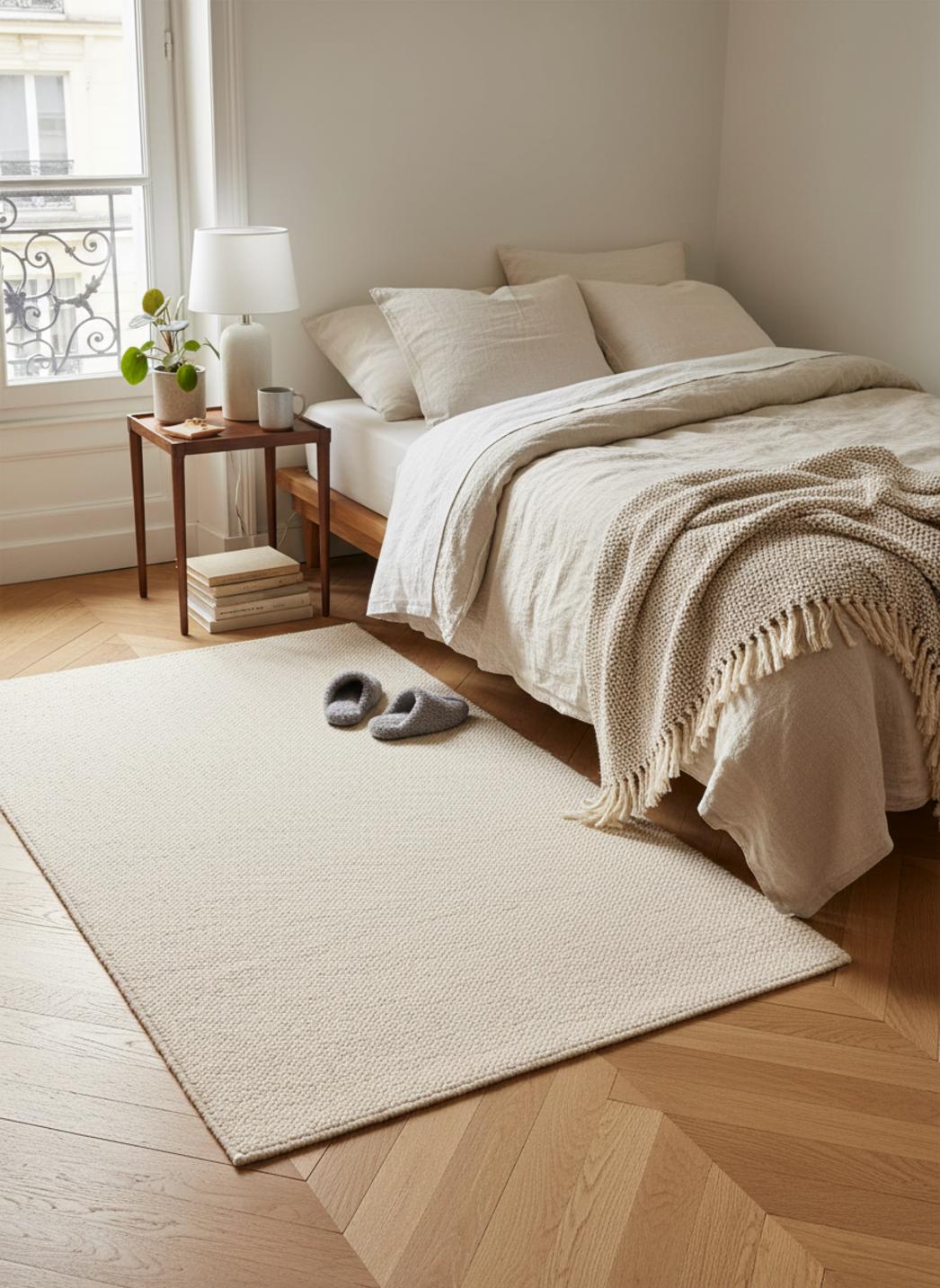 Dans un salon, une chambre ou un bureau, ce tapis instaure un point d'ancrage harmonieux qui structure l'espace et met en valeur les matières environnantes, du bois naturel aux métaux fins. Sa présence apporte une sensation accueillante et coordonnée, lisant la pièce avec sobriété et élégance, tout en autorisant des accords plus marqués avec des coussins ou des textiles complémentaires.