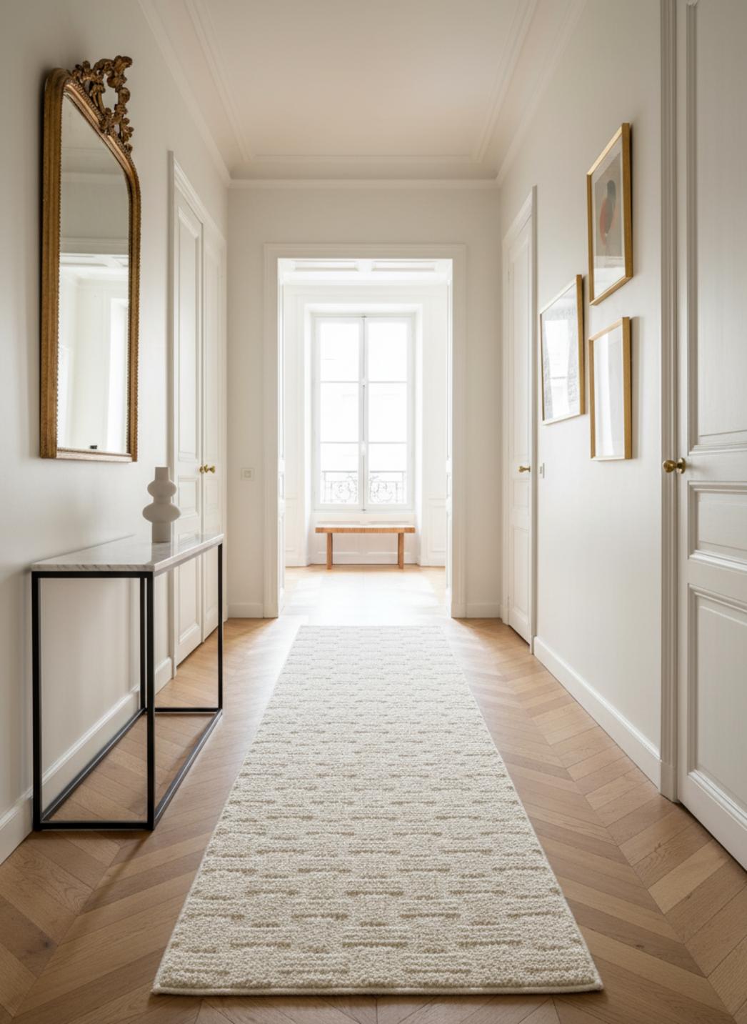 Pensé pour un passage ou une allée, le format couloir réorganise la perspective et guide le regard. La longueur étudiée permet de délimiter une circulation, d'ancrer une enfilade ou de lier deux espaces sans alourdir la composition. Le choix du 80x250 cm compose une bande élégante au sol, suffisante pour rythmer un couloir étroit ou structurer l'entrée d'une maison contemporaine.
