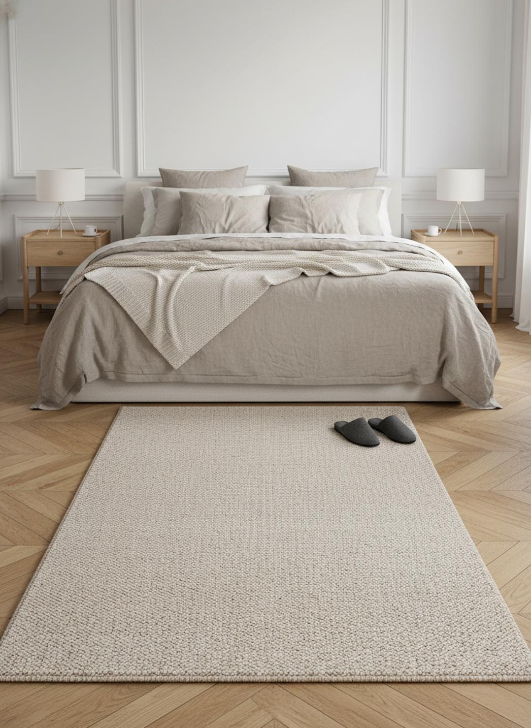 Pensé comme un objet de matière, son tissage délicat propose une surface généreuse au toucher. La structure tressé révèle une profondeur subtile, créant des reliefs qui captent la lumière et renforcent l'accueil. La densité maîtrisée invite à poser les pieds et à sentir l'architecture du sol, tandis que les finitions soignées garantissent une allure durable et raffinée.
