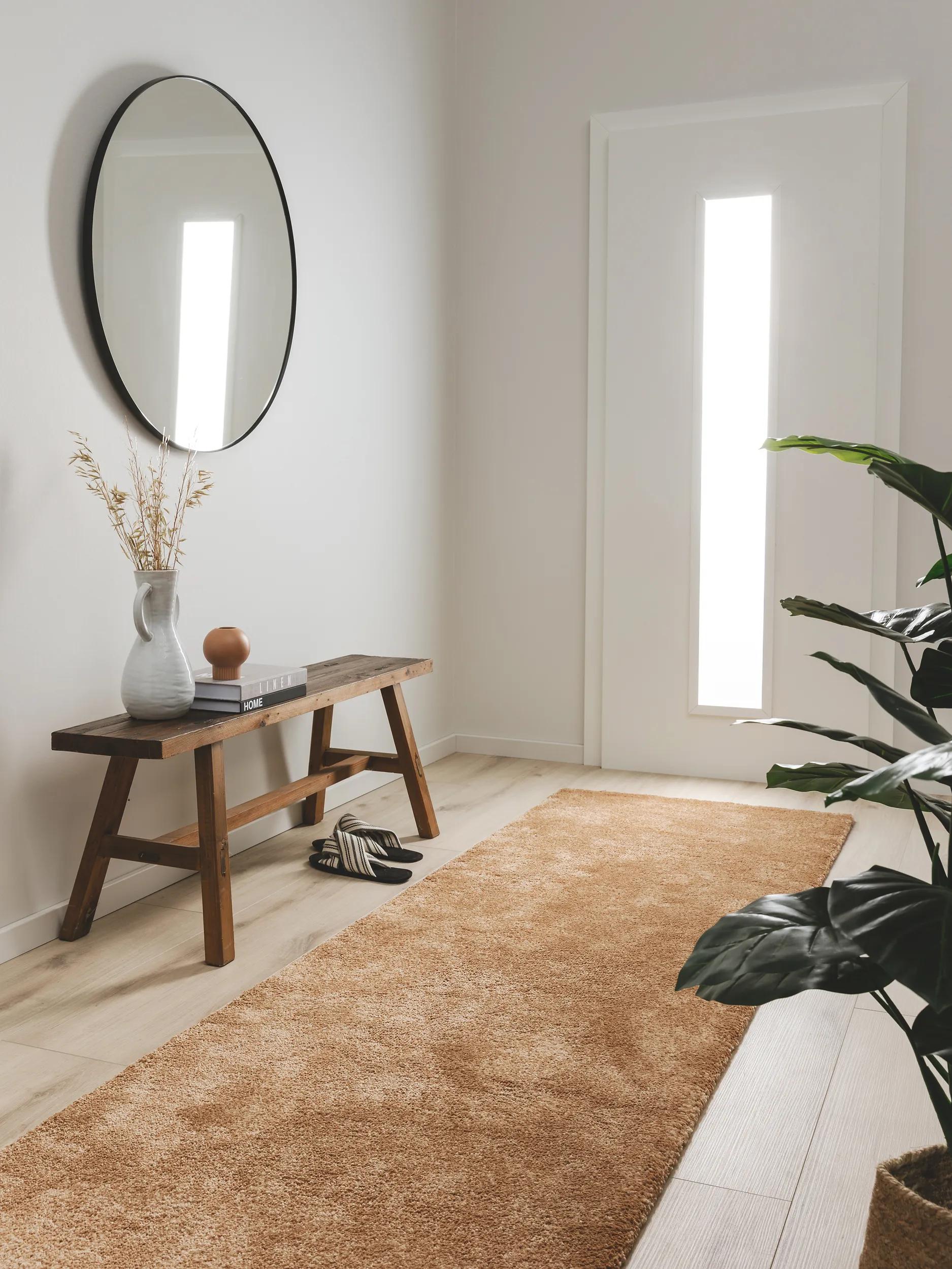 Sa capacité à définir une zone dans un plan ouvert est particulièrement visible lorsqu’il est placé le long d’un passage : le tapis pensé pour le couloir crée une trajectoire apaisée, une continuité élégante qui guide le regard. Le format allongé recentre la perspective et organise le mobilier environnant, offrant une transition sophistiquée entre deux ambiances.