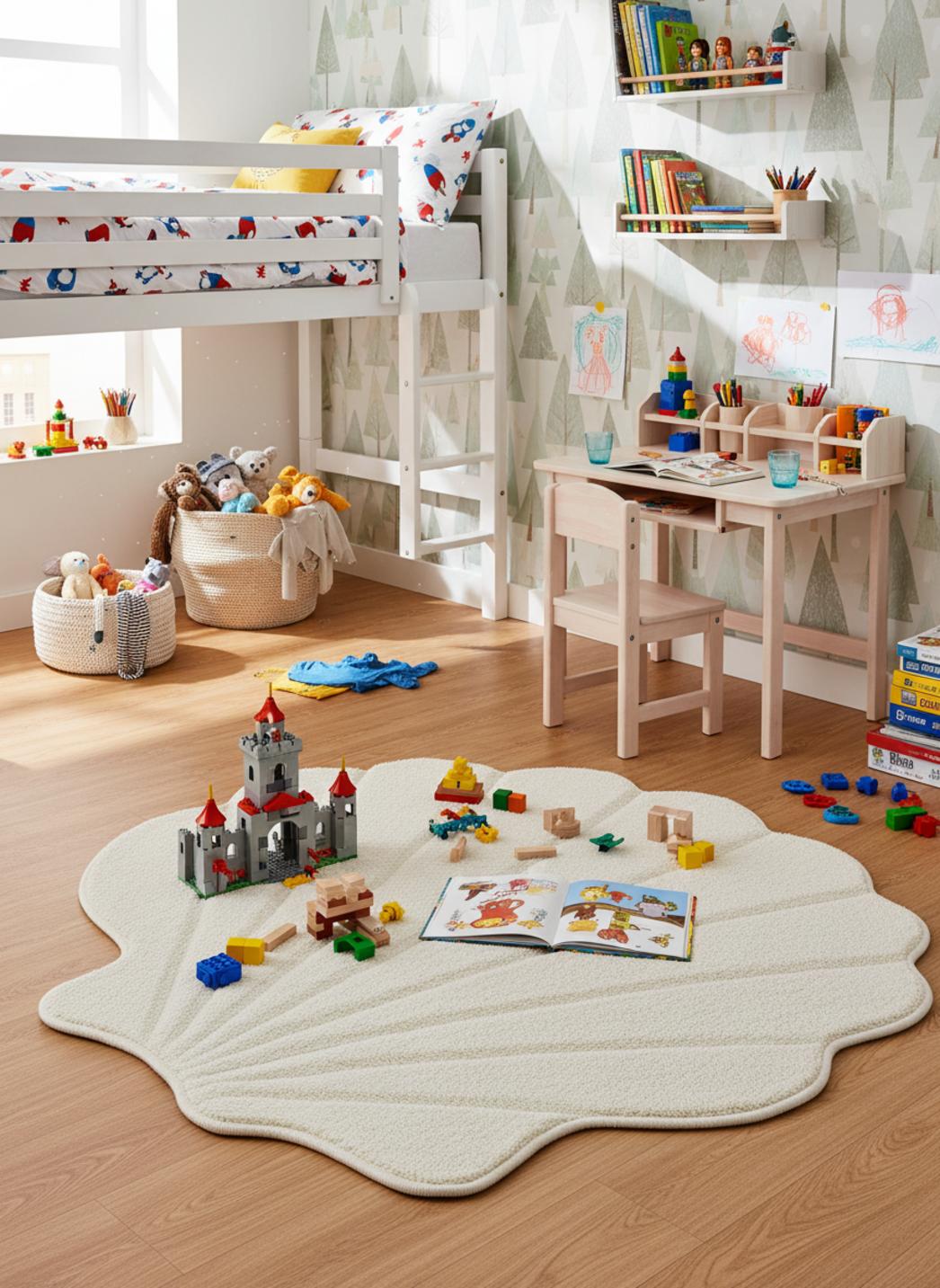 Dans les scènes quotidiennes, il devient le théâtre des grandes explorations : poupées étendues pour un pique-nique, voitures alignées pour un circuit, petites mains qui tournent les pages. Sa stabilité antidérapante garde les meubles en place et sécurise les routines du soir, pour que la lecture avant le coucher reste un rituel apaisant et immuable.