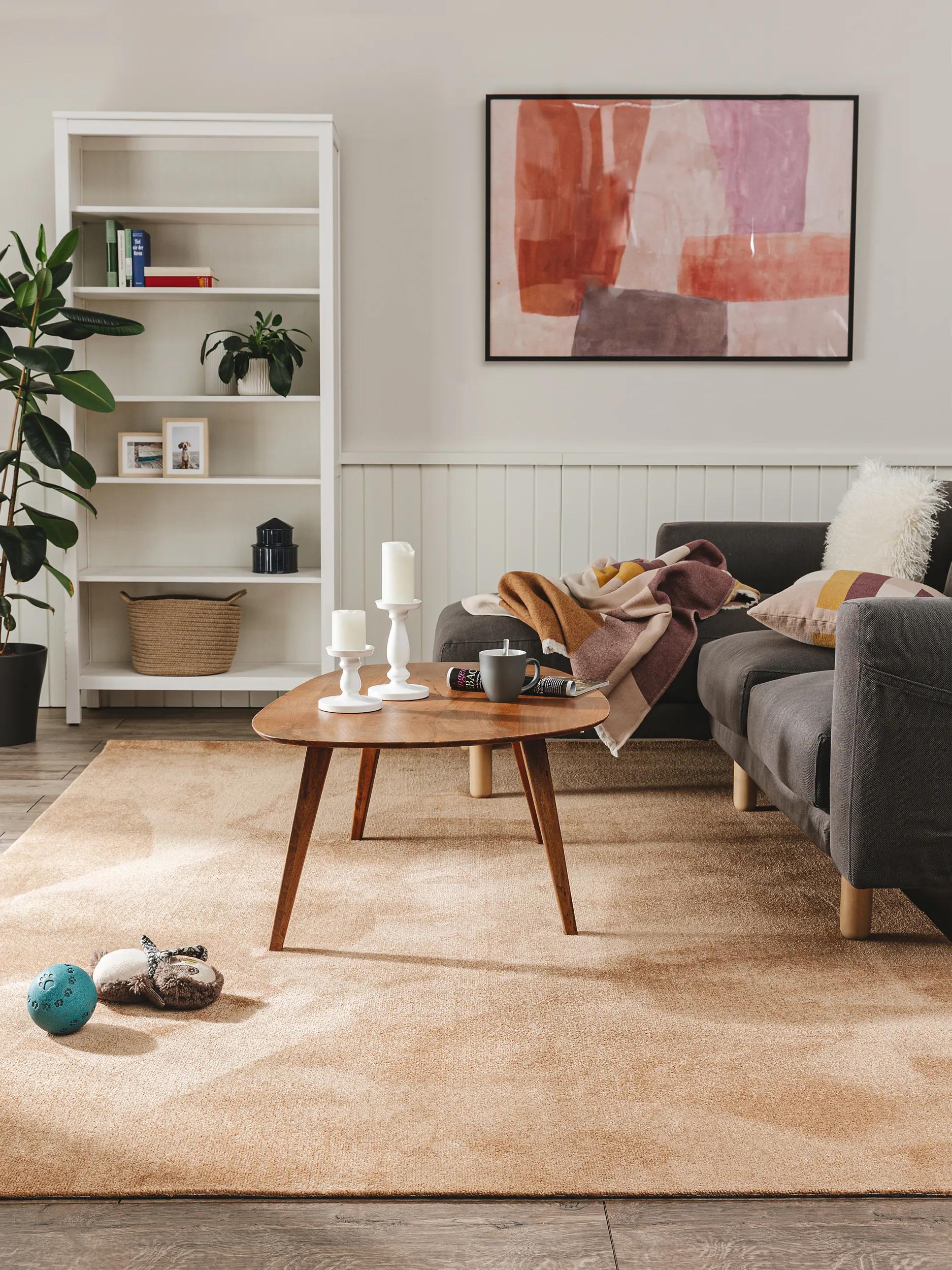 La matière, pensée pour un usage quotidien, combine tenue et douceur, avec une sensation accueillante sous les pas. L’atout lavable se présente comme une qualité discrète qui simplifie l’entretien sans altérer l’aspect noble du tapis. La surface, volontairement unie, révèle un tissage soigné, offrant un toucher dense et régulier qui renforce l’impression de confort premium.