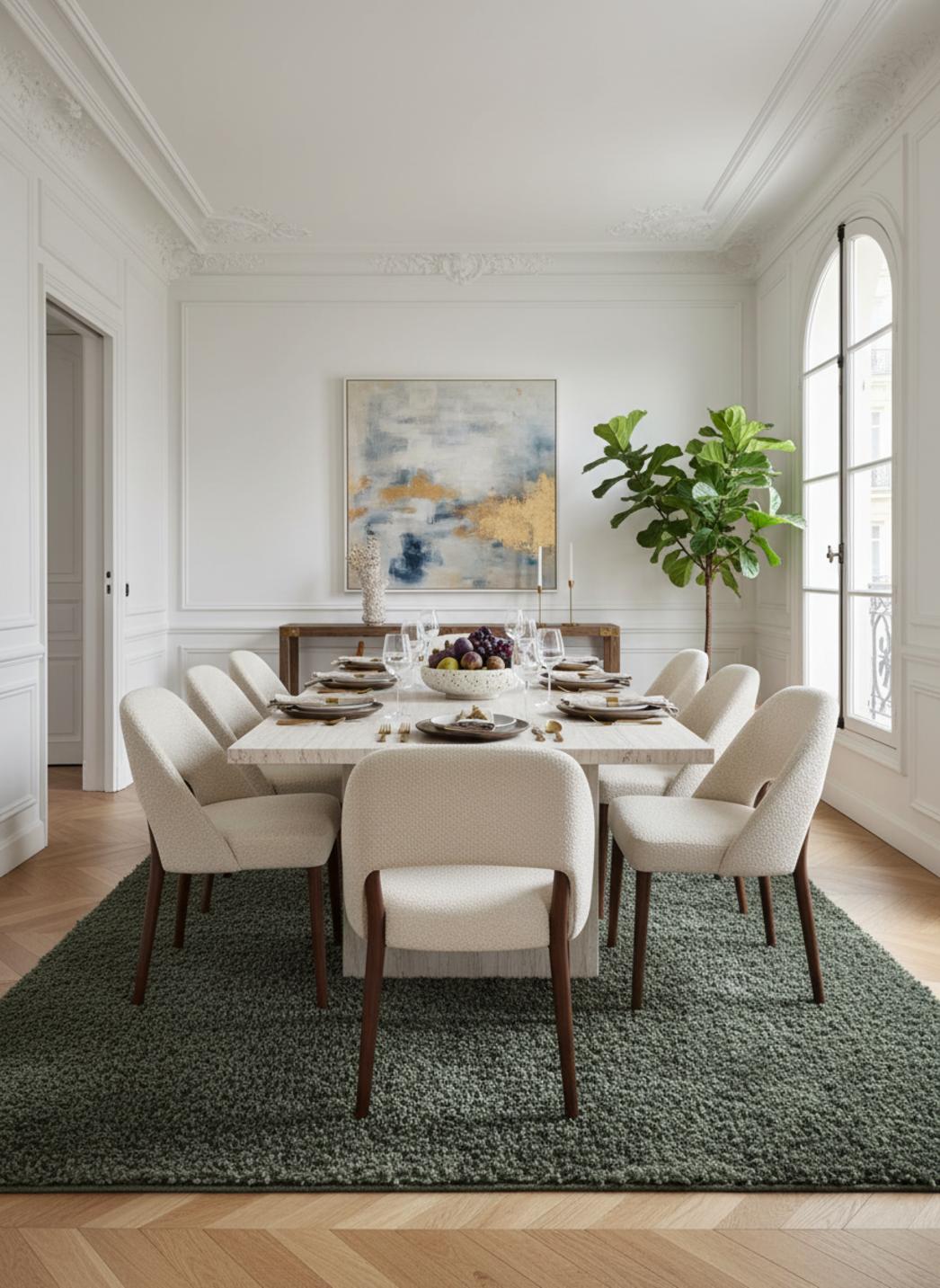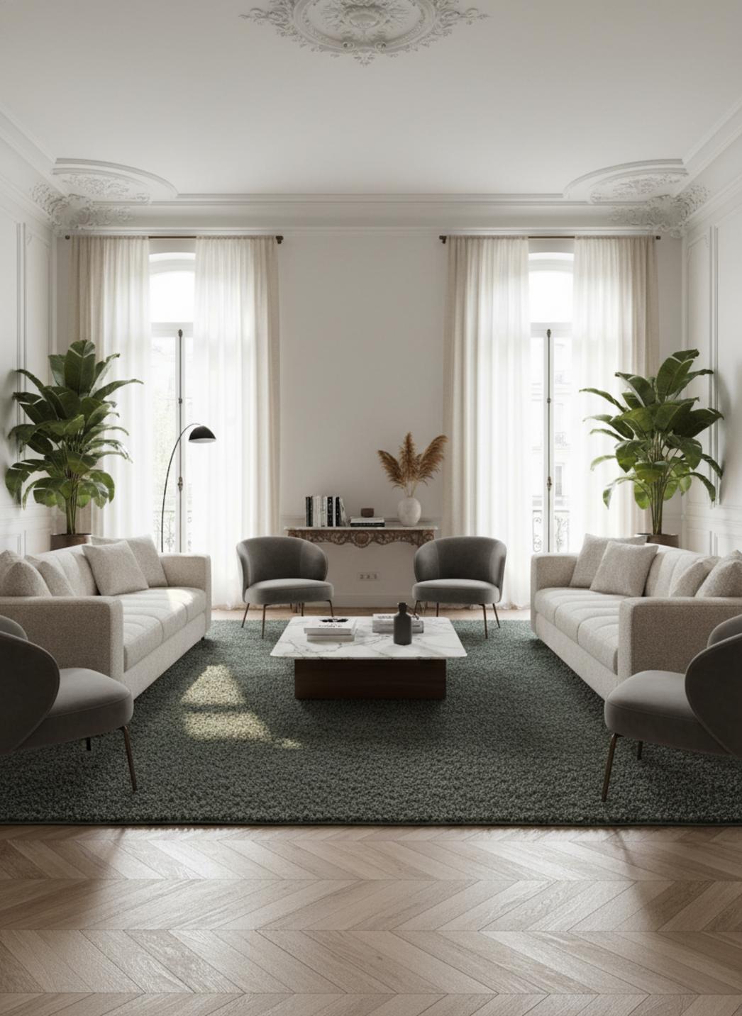 Pour une mise en scène contemporaine, ce tapis installe une atmosphère chaleureuse et graphique où chaque élément de la pièce trouve sa juste place, rehaussant canapés, fauteuils et luminaires avec une présence retenue. Pour découvrir d’autres créations contemporaines et design, explorez également notre collection complète de tapis modernes.