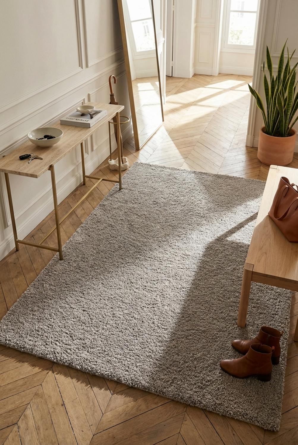 La silhouette sobre du tapis dialogue avec des matériaux actuels : bois clair, métal brossé ou lin texturé. Sa palette neutre magnifie la lumière ambiante et facilite les associations cromatiques, permettant d’accentuer une couleur ponctuelle ou de maintenir une atmosphère minimaliste et calmée. Il valorise le mobilier contemporain en proposant un écrin doux et modulable.