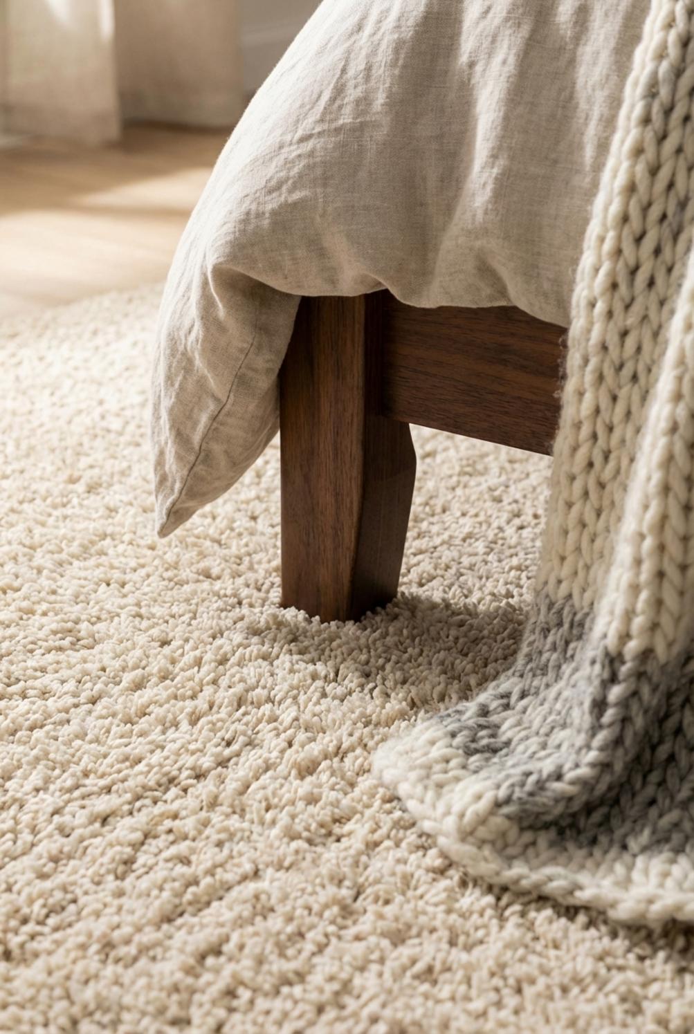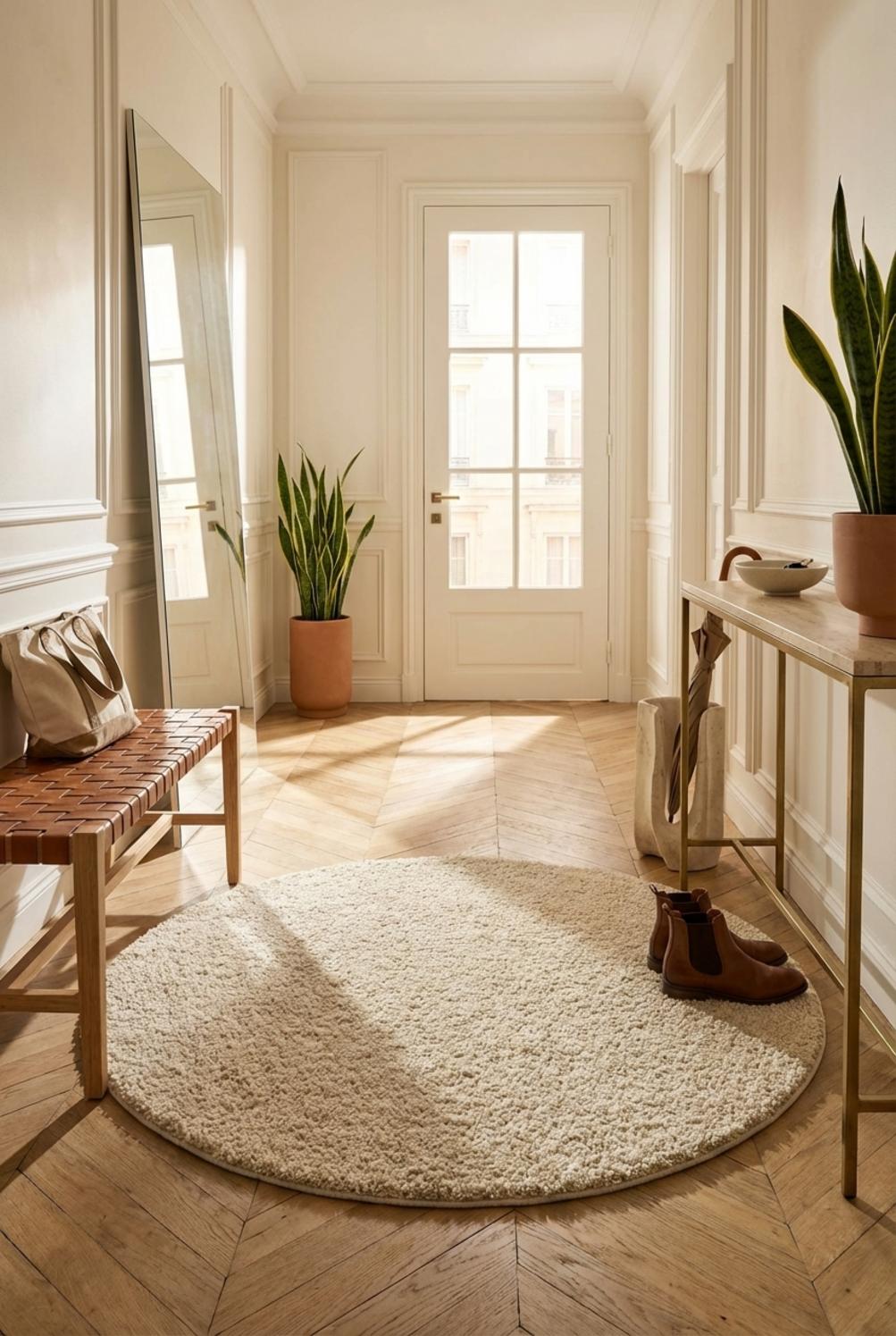 Sur un plan décoratif, l’alliance du ton naturel et du velouté des fibres offre une lecture apaisée et sophistiquée. Le choix d’une palette neutre favorise la mise en valeur des matériaux environnants, du bois clair aux accents métalliques discrets. Le tapis devient ainsi un élément d’équilibre qui révèle la géométrie des meubles sans imposer de motif, laissant la lumière et les volumes respirer dans un intérieur contemporain et serein.