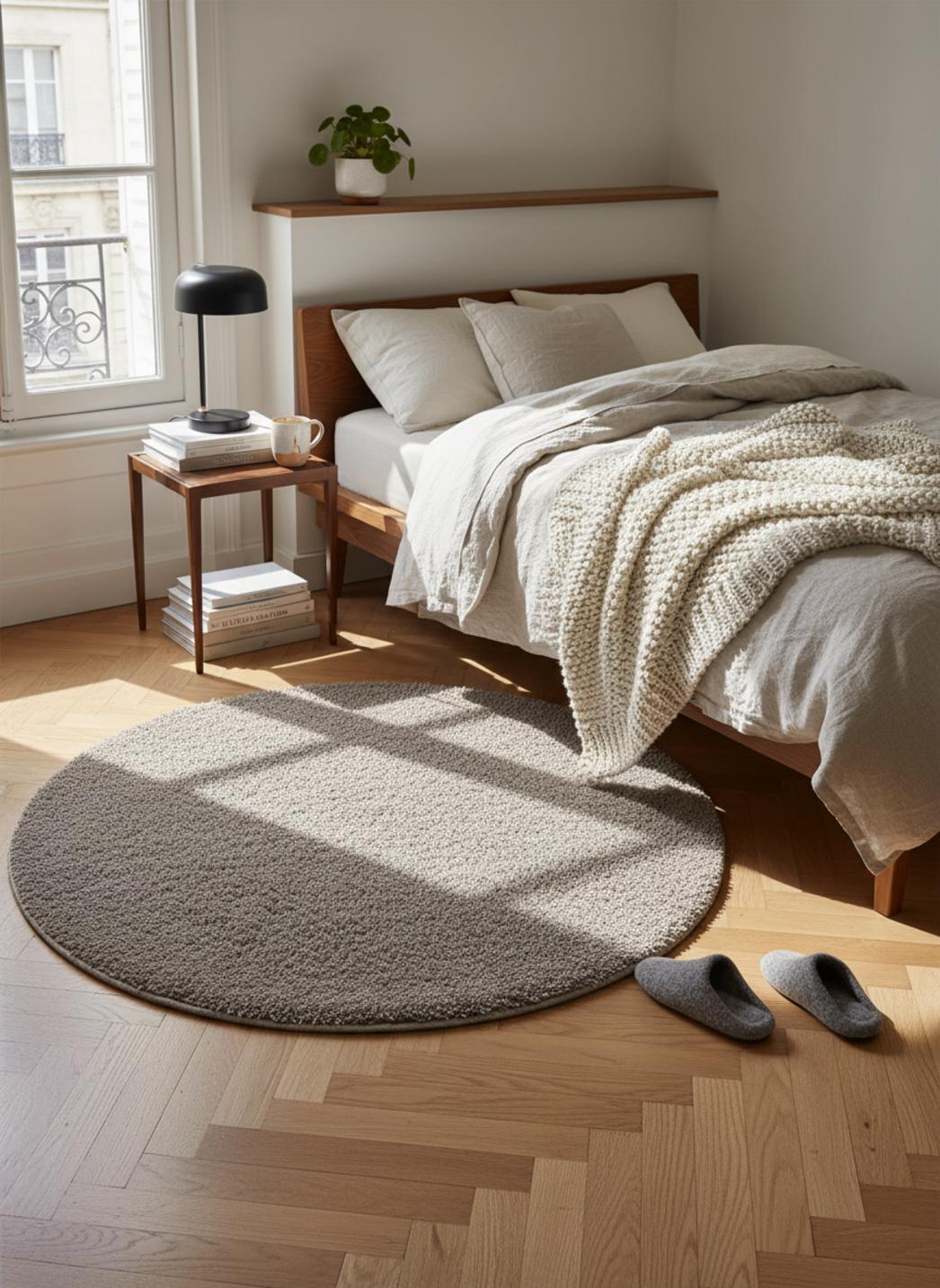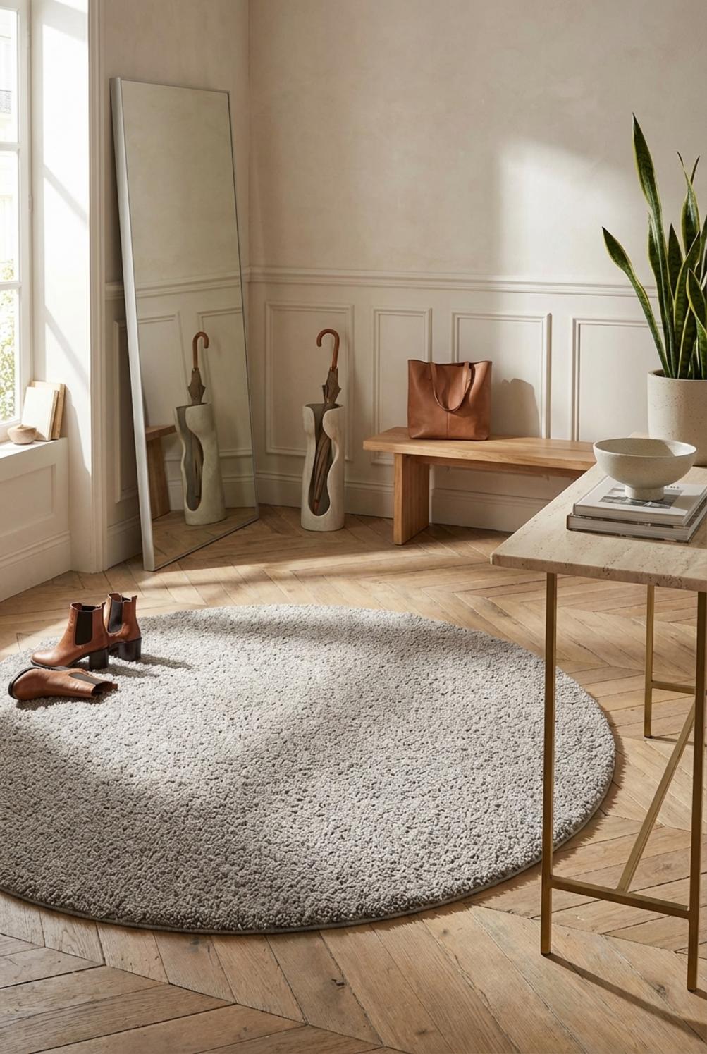 La géométrie douce de la pièce s’affirme par sa silhouette rond qui casse les angles et crée un point focal harmonieux. Avec un diamètre de 80 cm (diamètre pensé pour s’intégrer à un coin lecture, face à un fauteuil ou sous une petite table), il structure subtilement l’espace sans l’alourdir. Sa forme favorise une circulation fluide et instaure un rythme visuel apaisant, parfait pour les ambiances contemporaines où chaque objet respire.