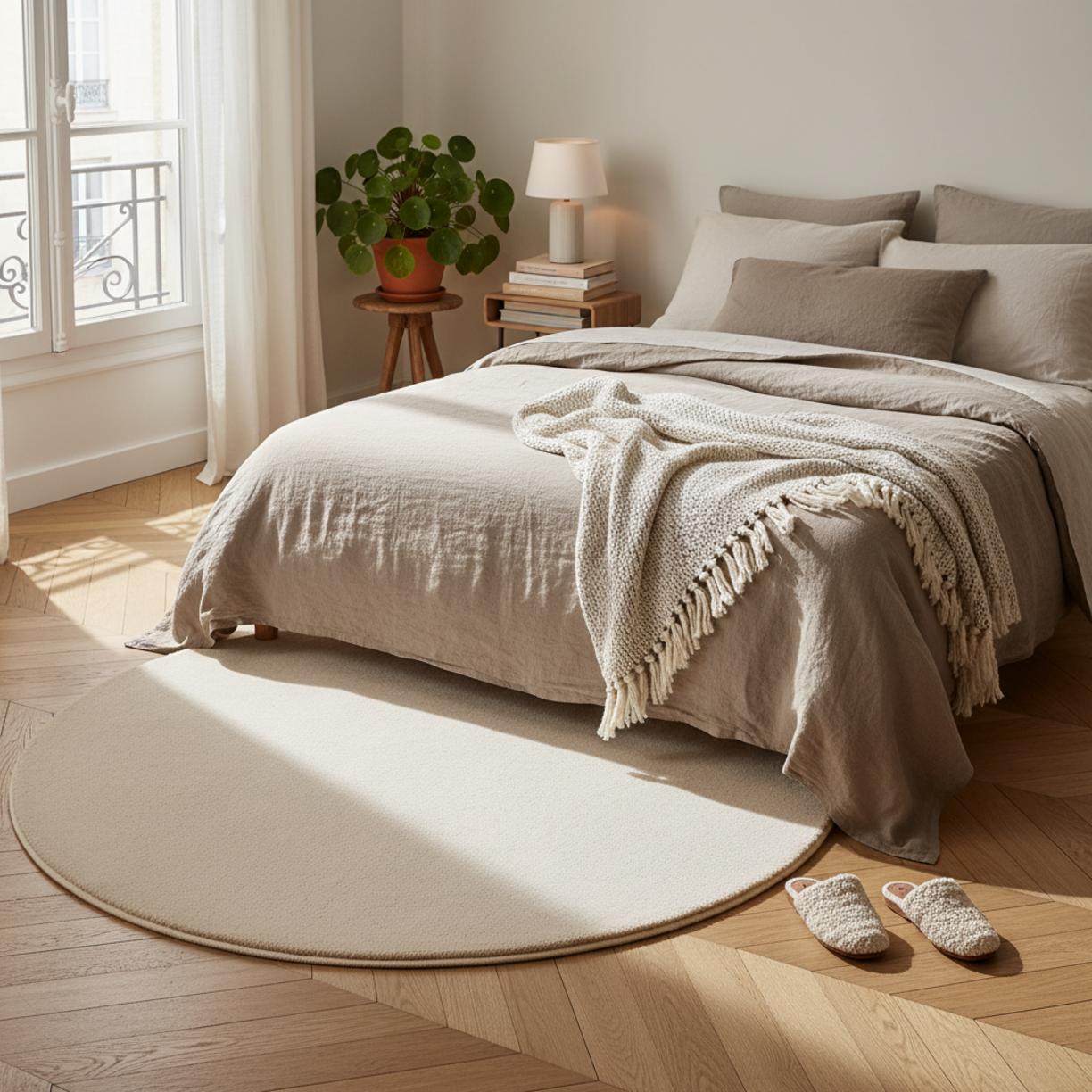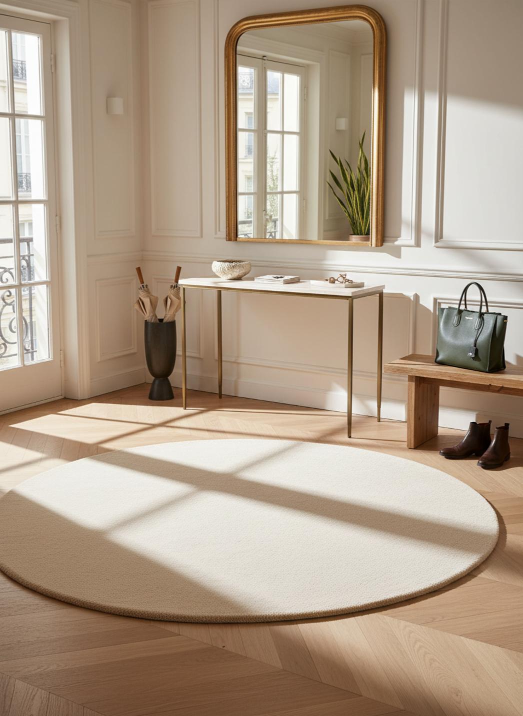 À l’échelle du mobilier, la forme rond instaure un point focal apaisant, parfait pour créer une zone conversationnelle ou réchauffer un coin lecture. Le diamètre de 100 cm permet de centrer un fauteuil ou de délimiter subtilement une table basse, sans imposer, en apportant une rondeur qui tempère les lignes droites du mobilier contemporain.