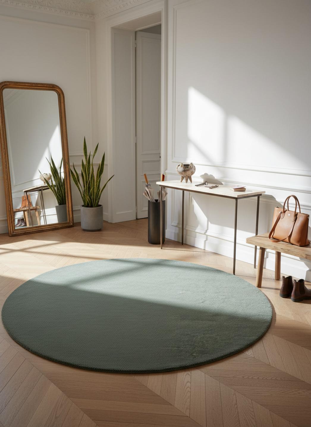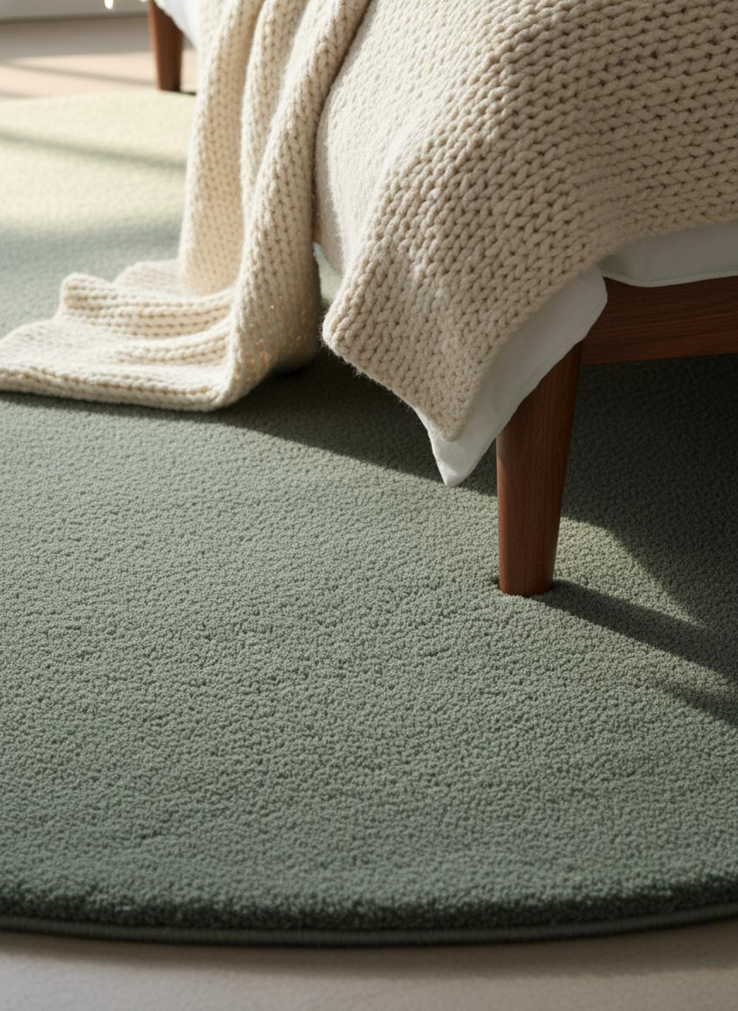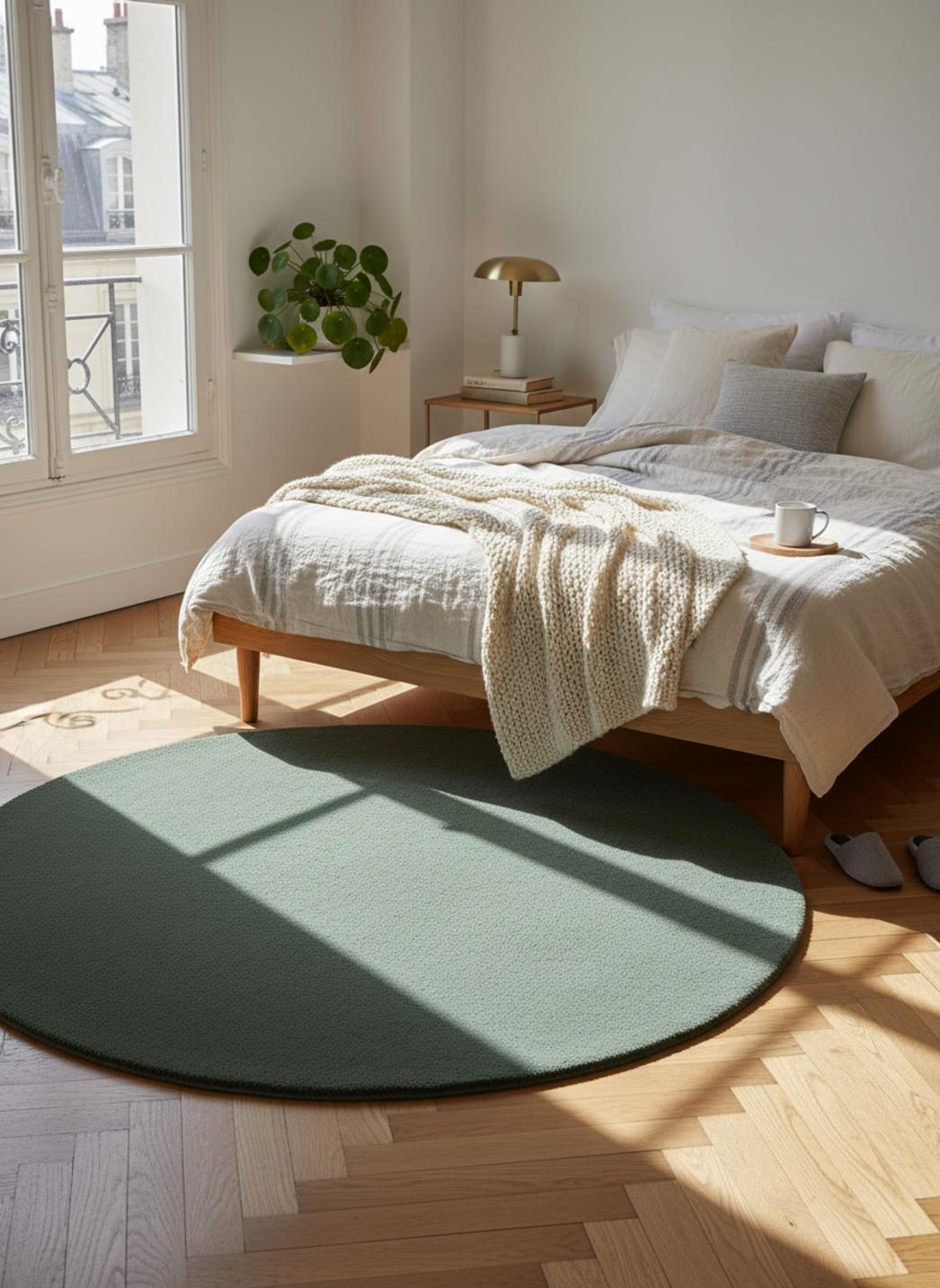 Pensé pour une chambre contemporaine, le tapis adoucit l’entrée au pied du lit et offre une sensation tactile réconfortante au réveil. La teinte vert choisie agit comme un fil conducteur : apaisante, elle s’accorde aux tons neutres et aux accents profonds, tout en conservant une modernité discrète. Les motifs absents laissent la place au rythme des matériaux environnants.