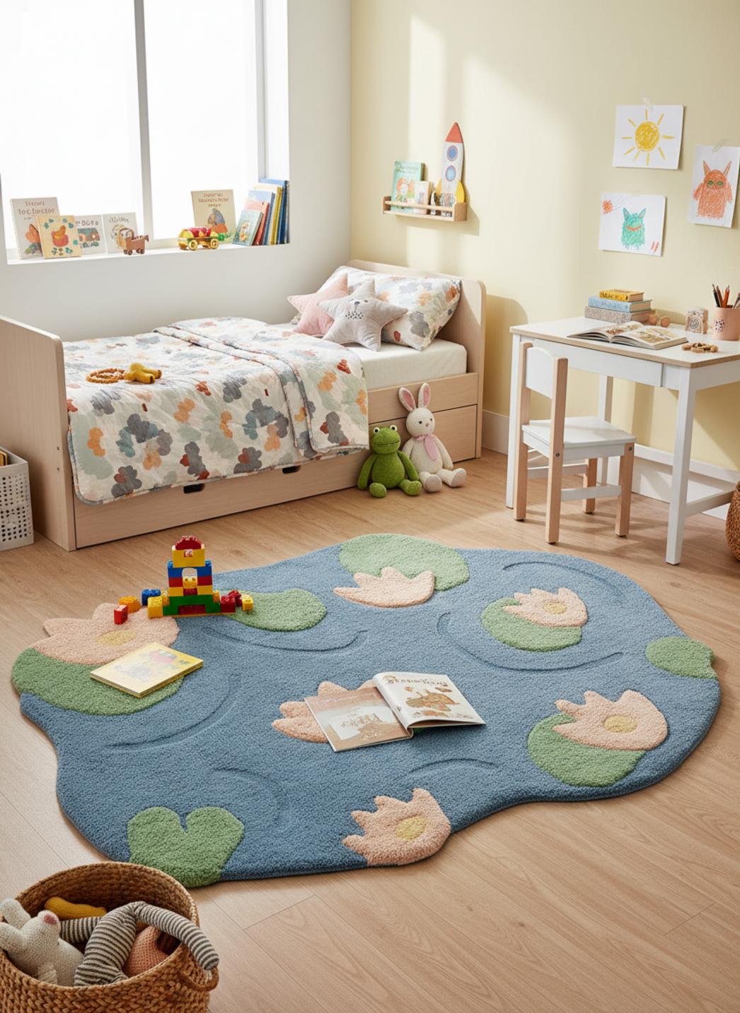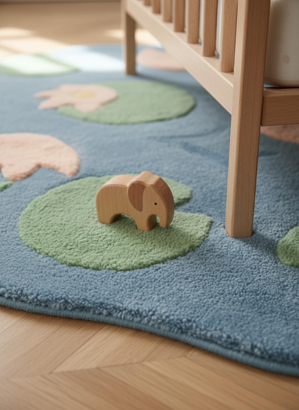 Quand la lumière du matin effleure la chambre, un coin doux se révèle pour les jeux et les rêves : un tapis qui invite aux histoires chuchotées et aux constructions en bloc. Tissé à la main, il offre un accueil moelleux et rassurant sous les petits pieds, ses nuances de bleu et de vert évoquant une mare paisible où l'imaginaire peut faire voguer des bateaux en papier.