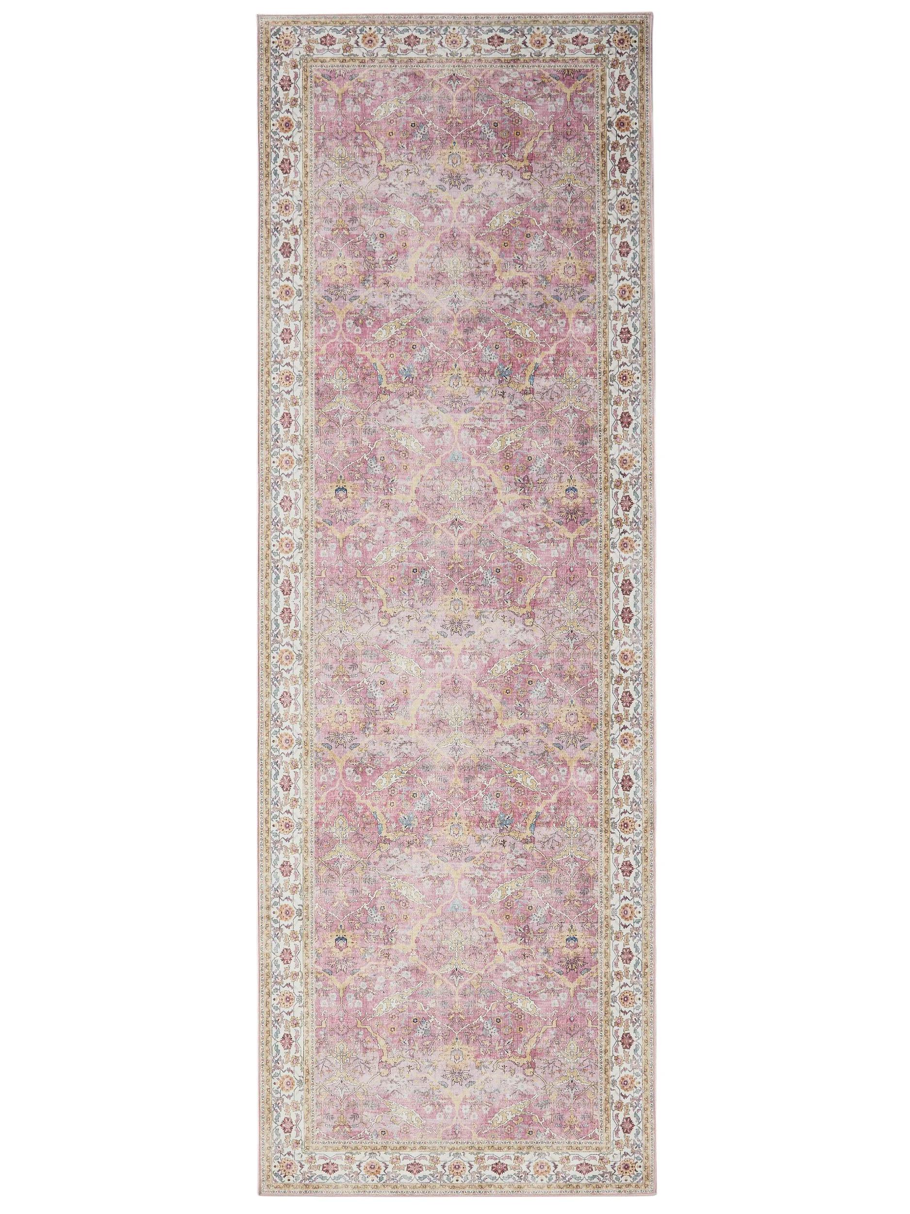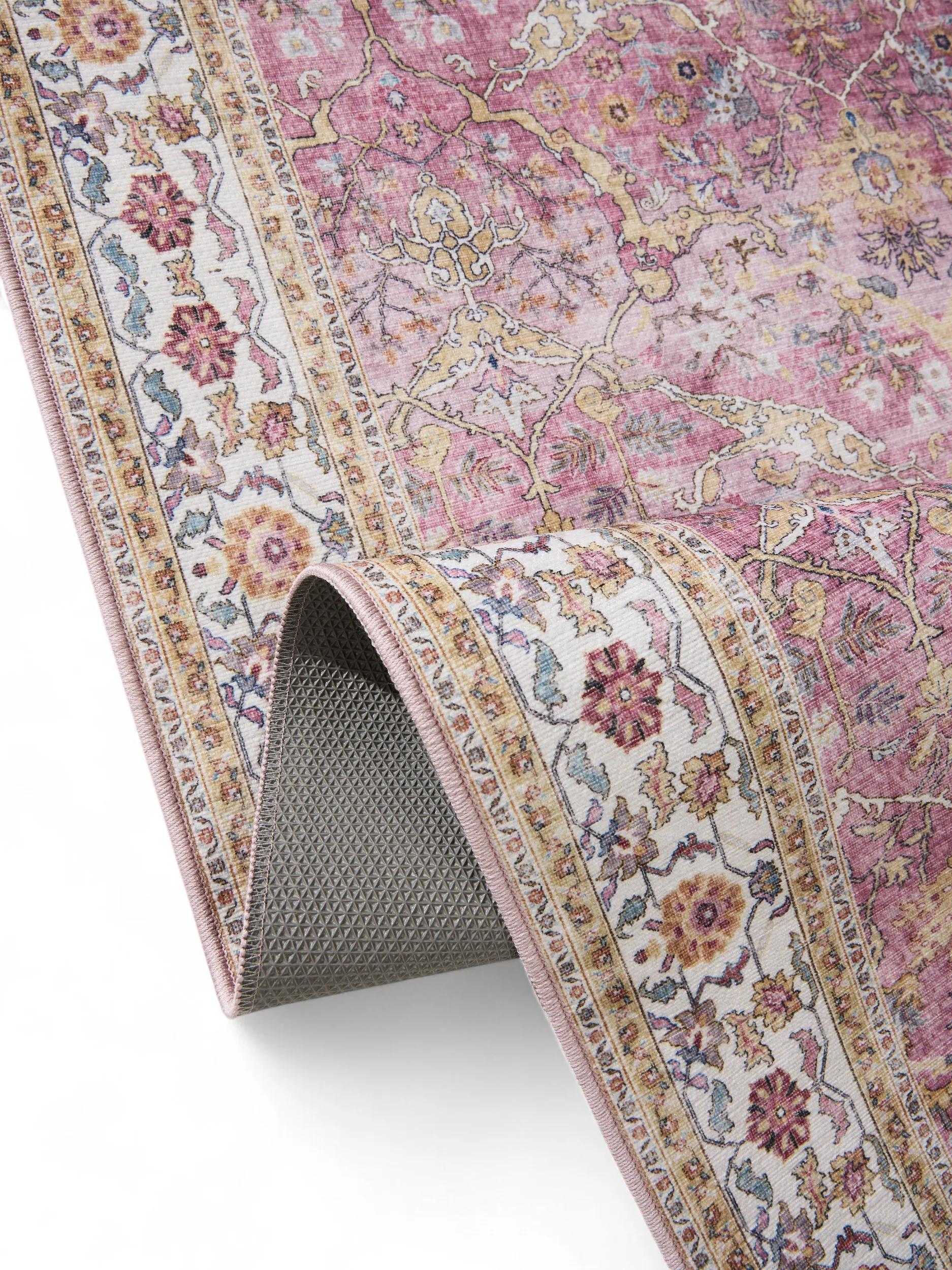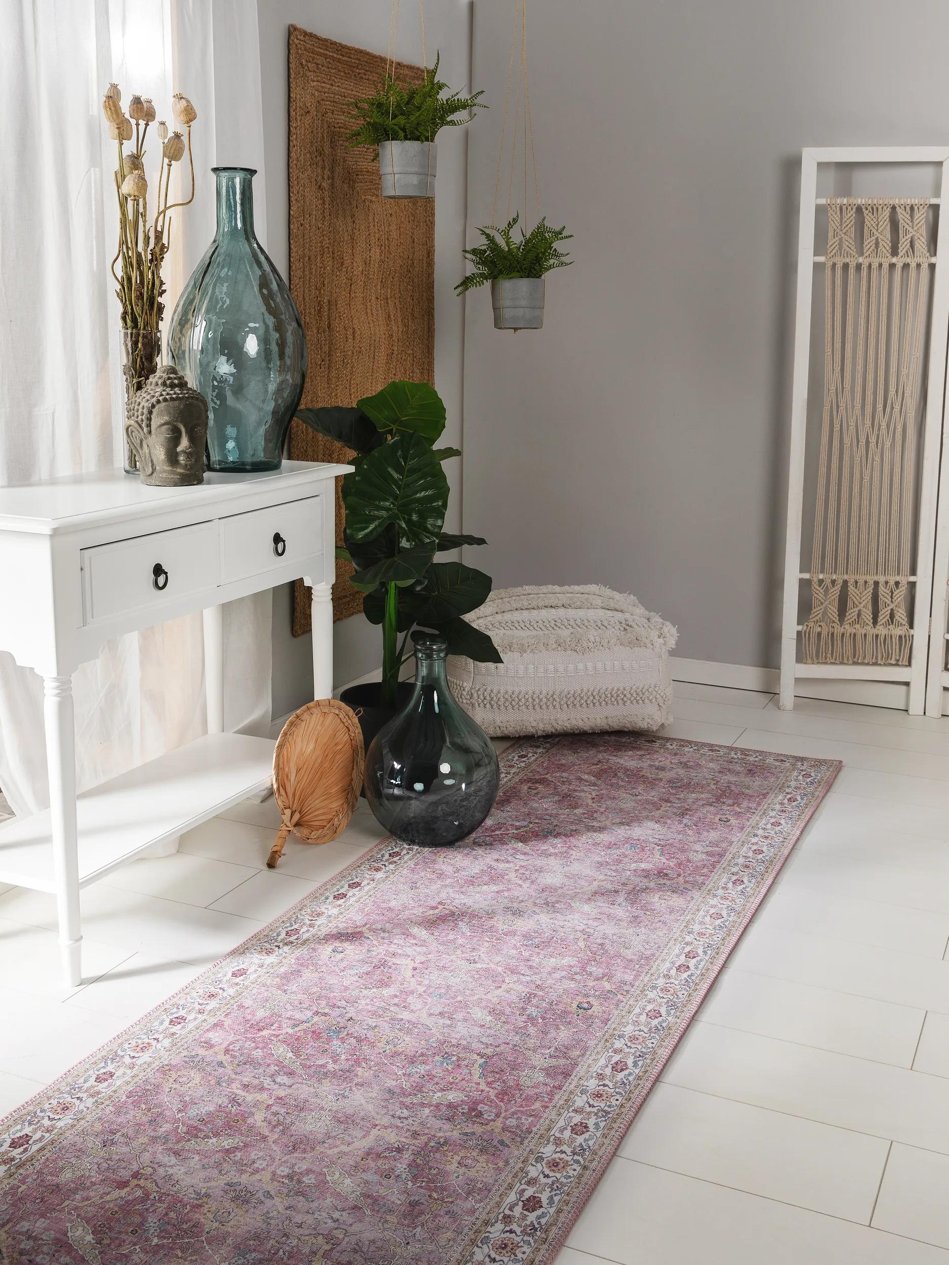 Sous vos pas, ce tapis respire une histoire patinée, une mémoire tissée qui évoque les caravanes de motifs oriental et les heures adoucies par le temps. La nuance rose se présente comme une teinte passée, posée en lavis sur des arabesques et des étoffes graphiques, donnant à la pièce une douceur visuelle qui rappelle le cuir vieilli et le papier jauni d’un vieux carnet de voyages.