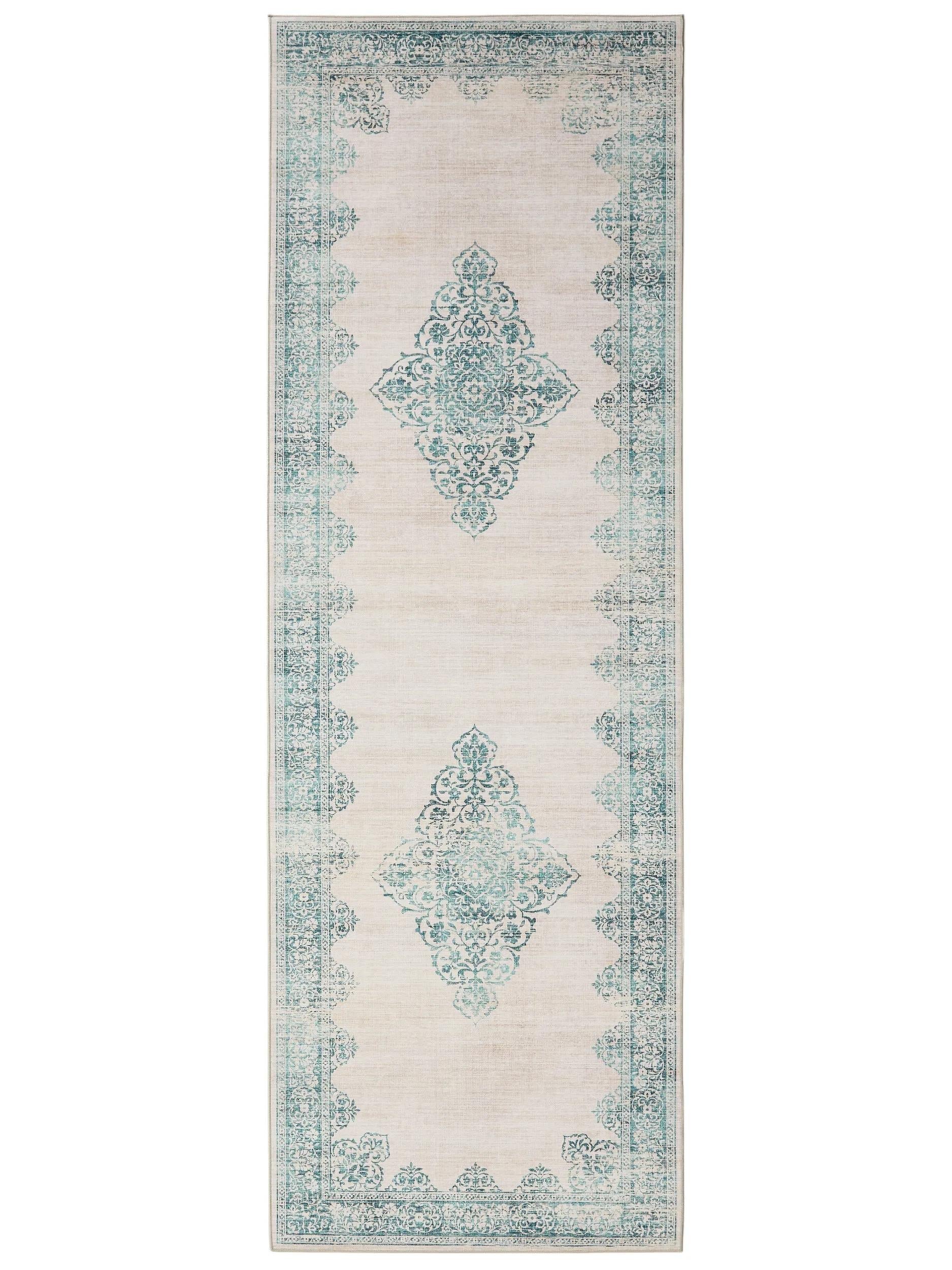 Lorsque l’on pose la main sur la surface, la douceur du tissage se fait sentir: la texture travaille la lumière, offre un confort discret sous les pieds et une sensation de chaleur élancée. Le format 80x240 cm répond à une exigence d’équilibre et d’harmonie pour les couloirs et les enfilades, tout en conservant une présence décorative forte. Le turquoise central module la luminosité de la pièce, rafraîchit les murs clairs et enrichit les tons chauds, influençant la perception de l’espace comme un filtre chromatique empreint de charme.