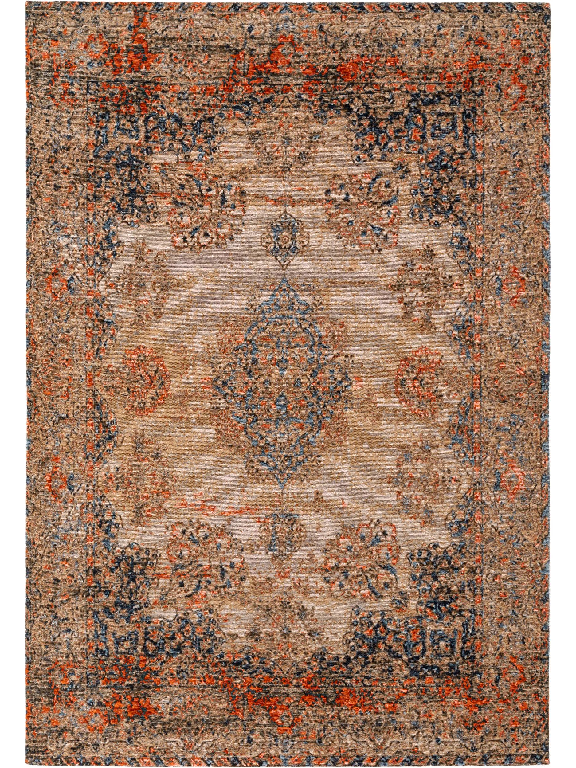 Au fil des pas, ce tapis évoque une mémoire tissée où le temps a laissé ses nuances les plus belles : un effet légèrement patiné qui adoucit les contours et révèle une richesse décorative presque archaïque. Les motifs inspirés des traditions orientales se mêlent à un travail chromatique raffiné, offrant des zones plus délicatement usées et d’autres plus contrastées, comme autant de couches d’histoire que l’on découvre en approchant. La présence d’un ensemble de teintes multicolore participe à ce récit visuel, faisant vibrer le sol comme une page reliée au passé.