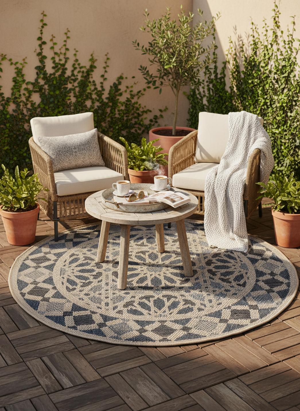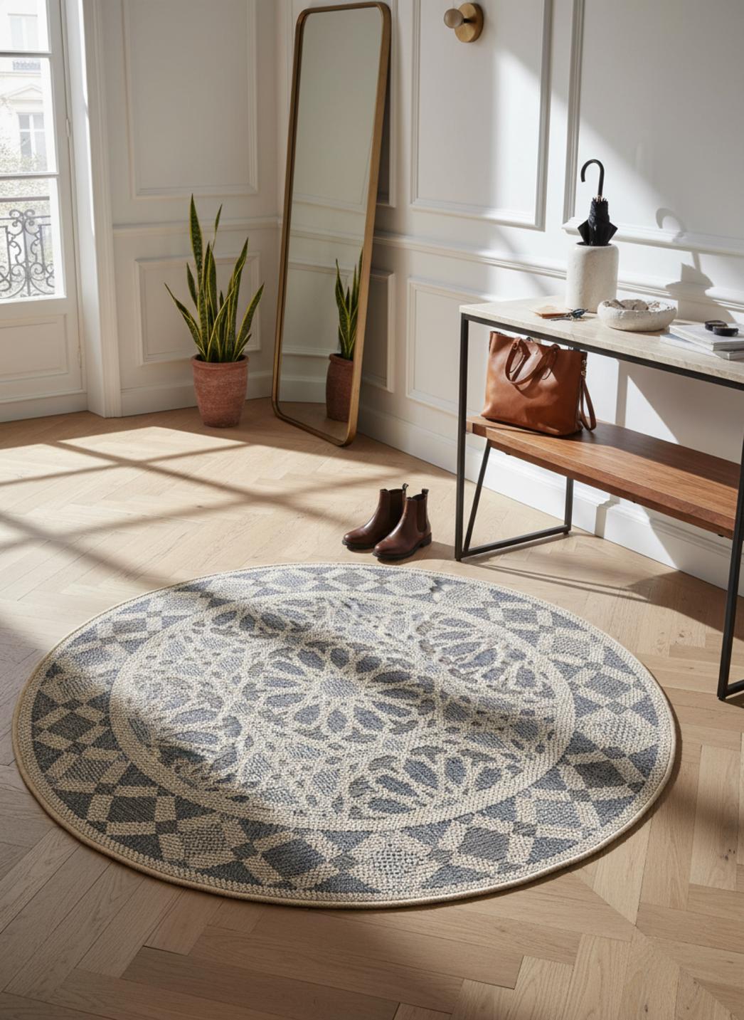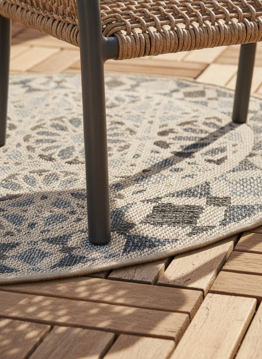 Raffiné et intemporel, ce tapis au style oriental séduit par la finesse de ses motifs et l’harmonie douce de ses tons gris et beige. De forme ronde avec un diamètre de 130 cm, il s’intègre parfaitement sur une terrasse, un balcon ou un patio, où il apporte une touche d’élégance classique et équilibrée. Son motif inspiré des tapis orientaux traditionnels évoque le charme des décors anciens revisités dans une palette contemporaine et lumineuse. Le gris, sobre et raffiné, se marie au beige, chaleureux et naturel, pour créer un contraste subtil et apaisant. Sa forme ronde adoucit les lignes de l’espace, invitant à la convivialité et à la détente. Ce tapis s’accorde idéalement avec les matières naturelles comme le bois, la pierre ou le rotin, renforçant une ambiance chic et harmonieuse. Véritable symbole de raffinement oriental revisité, il transforme les extérieurs en lieux sereins, accueillants et empreints d’un charme intemporel.