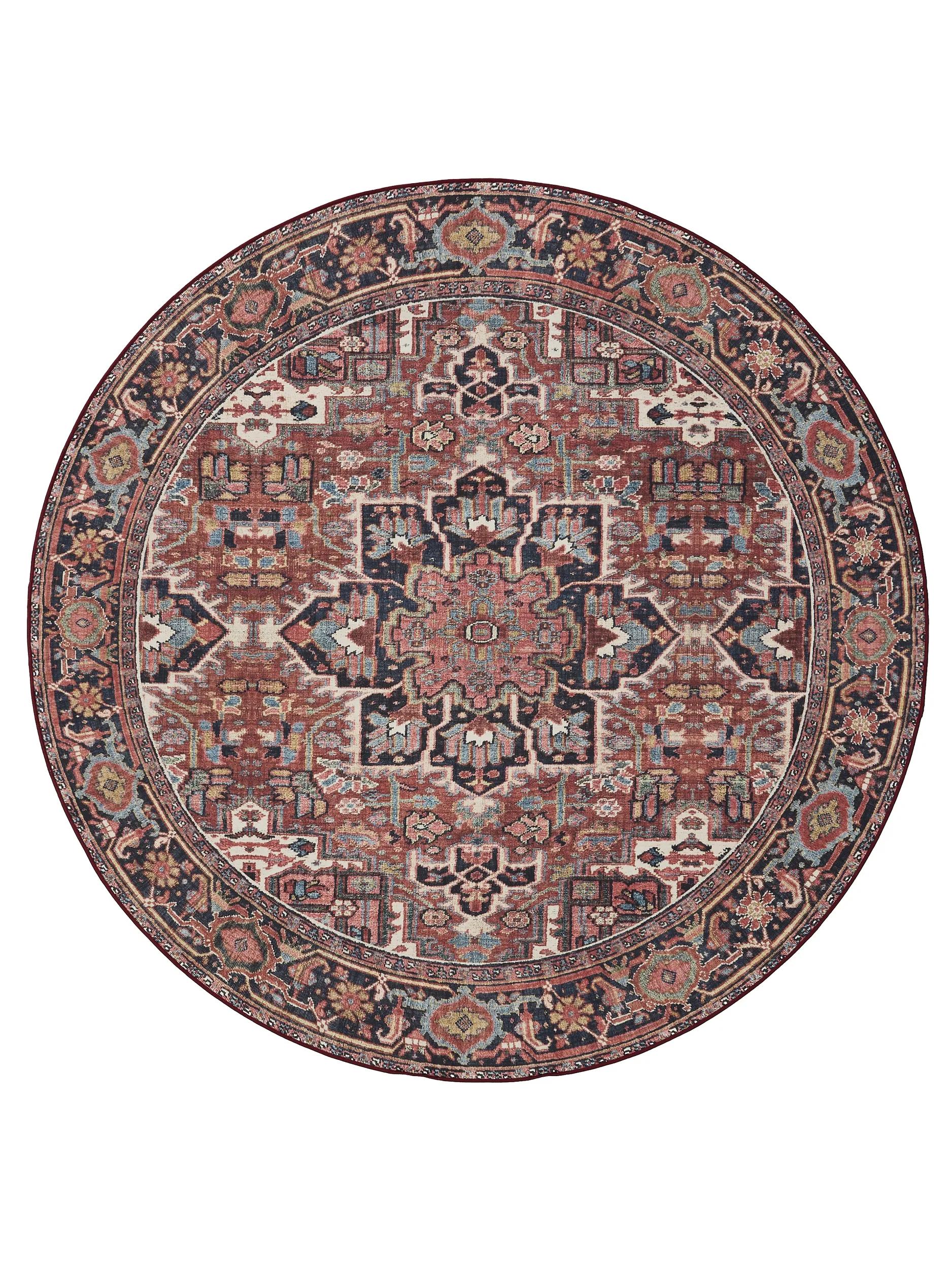 Tapis oriental rond multicolore tons rouges lavable 120 cm de diamètre