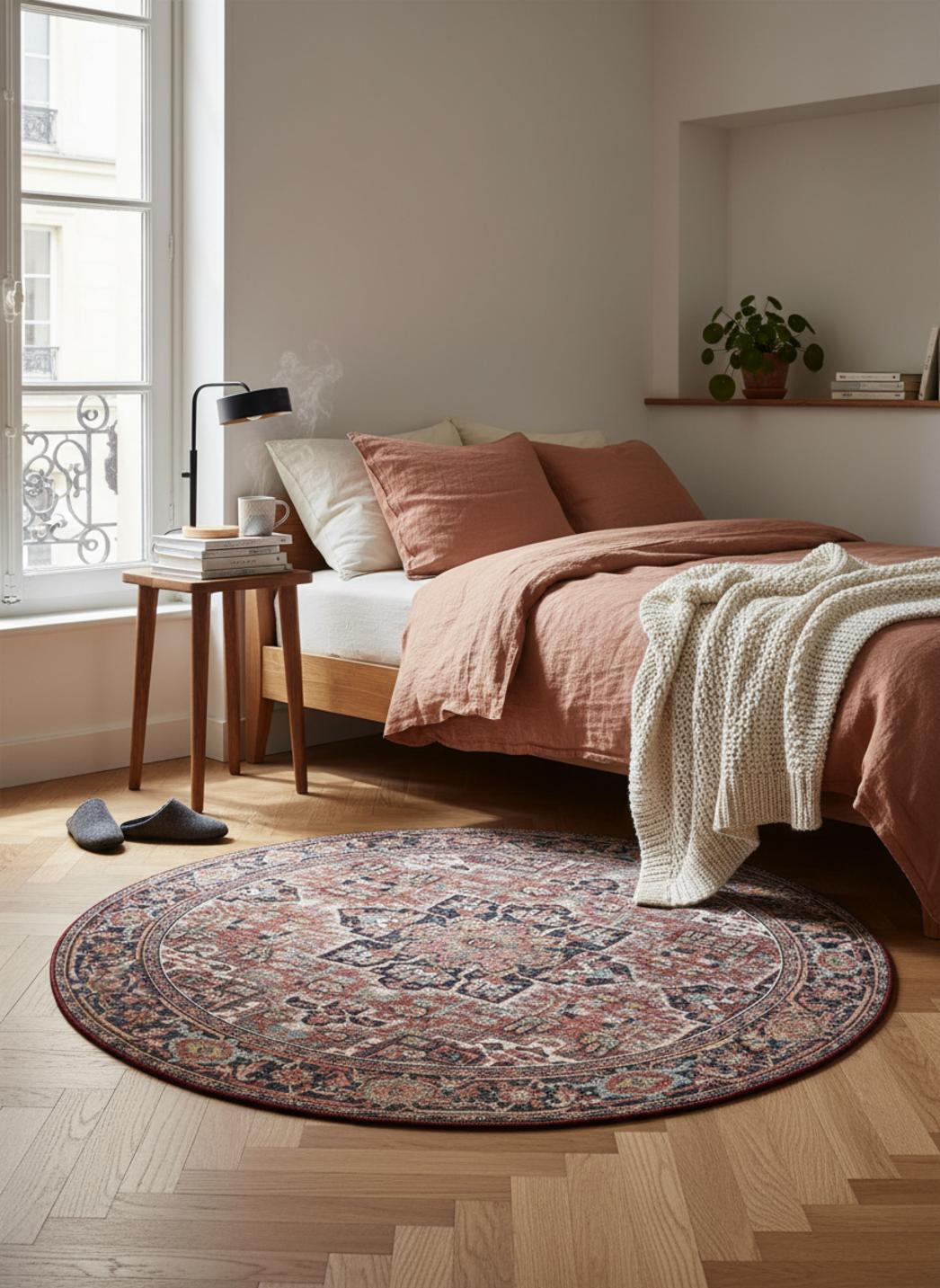 Le format pensé pour l’espace est volontairement étudié : rond et mesurant 120 cm de diamètre, il offre une rupture douce dans les axes rectilignes d’un salon ou d’une chambre. Posé sous une table basse, à l’entrée d’un bureau prestigieux, ou comme îlot central dans une chambre feutrée, il définit sans imposer, accompagnant la circulation et guidant le regard vers un centre sculptural. Cette dimension permet autant l’intégration dans une salle à manger élégante que l’accentuation d’un coin lecture intime.