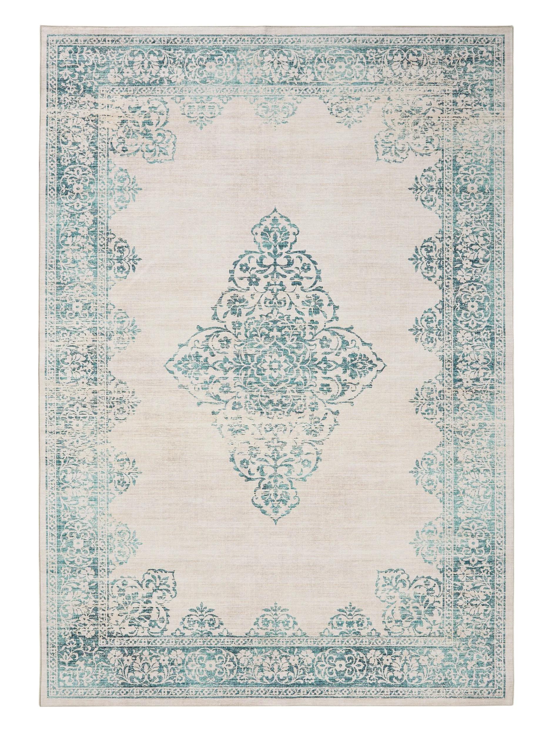 Au premier regard, la patine raconte des années, un vécu délicatement inscrit dans les fils, offrant une profondeur visuelle où le charme du temps dialogue avec une palette apaisée ; le motif oriental s’étire comme une mémoire décorative, ponctuée de touches turquoise et de veines gris qui semblent avoir été adoucies par le soleil et le passage des saisons, le tout magnifié par une dimension équilibrée de 160x230 cm qui impose sa présence sans jamais alourdir l’espace.