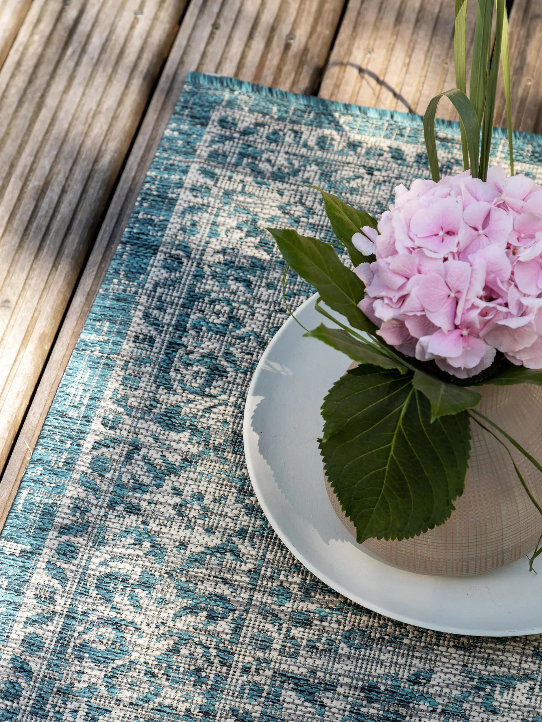 Ce tapis oriental au charme vintage revisite les motifs traditionnels dans une palette de bleu apaisante et raffinée. Ses arabesques délicatement estompées rappellent les tapis anciens patinés par le temps, tout en s’inscrivant dans une approche contemporaine idéale pour les extérieurs élégants. Sa teinte bleue, profonde et nuancée, diffuse une lumière douce qui invite à la détente et s’accorde harmonieusement avec les matières naturelles comme le bois clair, le rotin ou la pierre. Placé sur une grande terrasse, sous une pergola ou dans un coin lounge extérieur, il crée une atmosphère à la fois sereine et pleine de caractère. Ce modèle illustre parfaitement l’esprit intemporel et raffiné de la collection de tapis d’extérieur, pensée pour sublimer les espaces à vivre au grand air. On retrouve la même profondeur chromatique et cette élégance paisible dans notre sélection de tapis d’extérieur bleus, parfaits pour prolonger cette ambiance méditative. Un tapis qui marie tradition et modernité avec finesse, et transforme la terrasse en un lieu de calme et de distinction.
