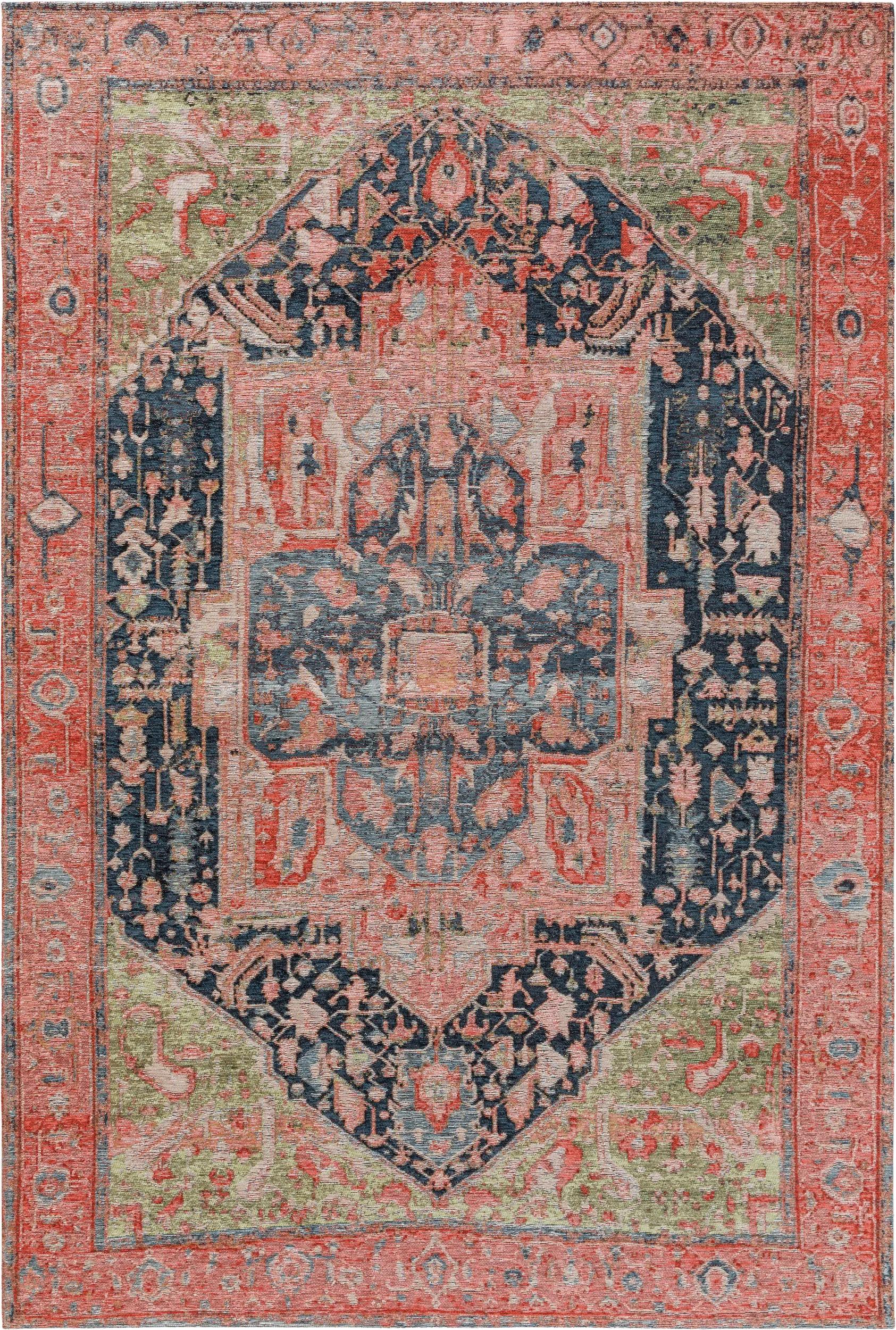 Dans son graphisme, l’ancien se fait moderne par une interprétation subtile des motifs : les arabesques et les géométries orientales retrouvent une seconde vie dans un effet légèrement vieux et « distressed », où le contraste entre champs et bordures s’adoucit pour offrir une profondeur chromatique enveloppante. Les accents rouge patinés modulés par des tons feutrés modifient la lumière de la pièce, la rendant plus intime et plus enveloppante, comme si le tapis tamisait l’éclat pour instaurer une atmosphère propice à la lecture et à la convivialité.