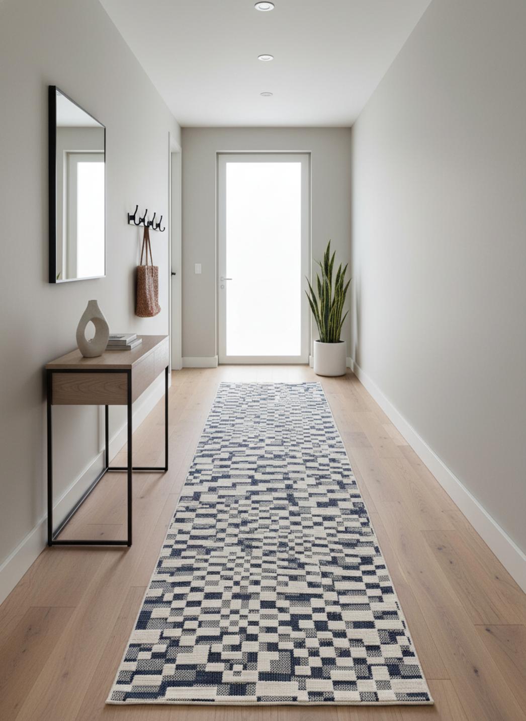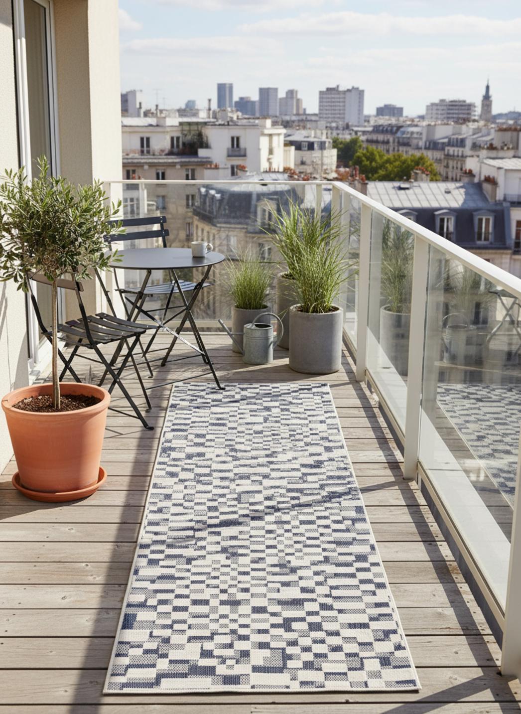 Élégant et audacieux, ce tapis patchwork abstrait bleu et gris déroule son jeu de nuances le long du couloir comme une œuvre d’art contemporaine. Ses formes fragmentées et ses contrastes subtils évoquent les reflets changeants de la lumière sur la pierre et l’eau, créant une atmosphère à la fois apaisante et raffinée. Dans un passage abrité, une entrée extérieure ou une allée de terrasse, il guide le regard et structure l’espace avec un équilibre maîtrisé. Le bleu, profond et frais, dialogue avec les gris nuancés pour composer un tableau moderne, empreint de calme et de fluidité. Ce tapis de couloir d’extérieur s’intègre parfaitement dans un environnement épuré, entre matériaux minéraux et textures naturelles. Ses 80x300 cm dessinent une ligne visuelle nette, idéale pour accompagner le pas et prolonger la perspective. Chaque motif, chaque teinte semble en mouvement, donnant au décor une dimension vivante et artistique. Sous une lumière rasante, ses couleurs se transforment, révélant toute la richesse de son tissage et la profondeur de son style. Plus qu’un simple élément décoratif, ce tapis patchwork devient une véritable signature visuelle : celle d’un espace contemporain où la rigueur du design rencontre la poésie des couleurs.