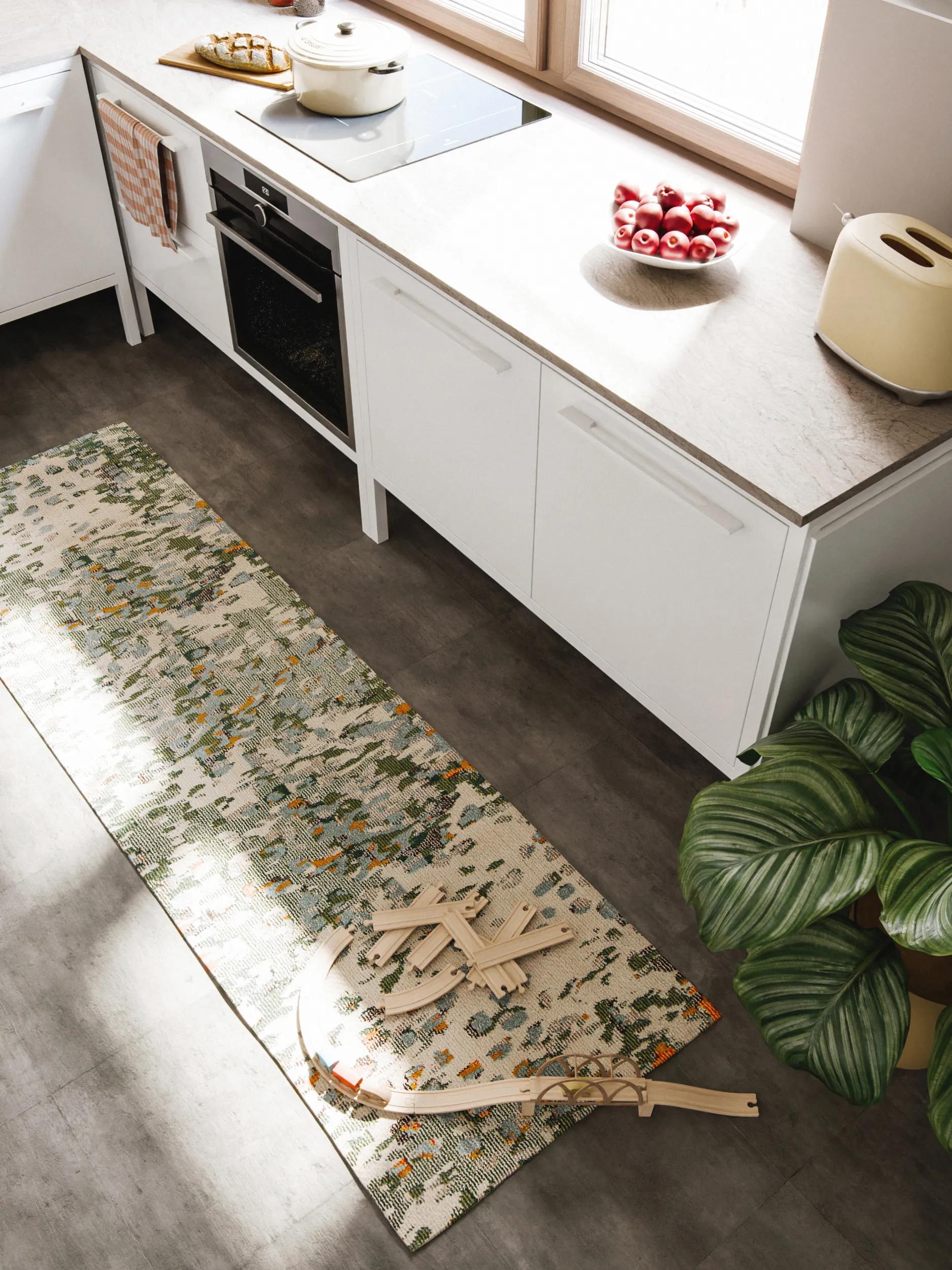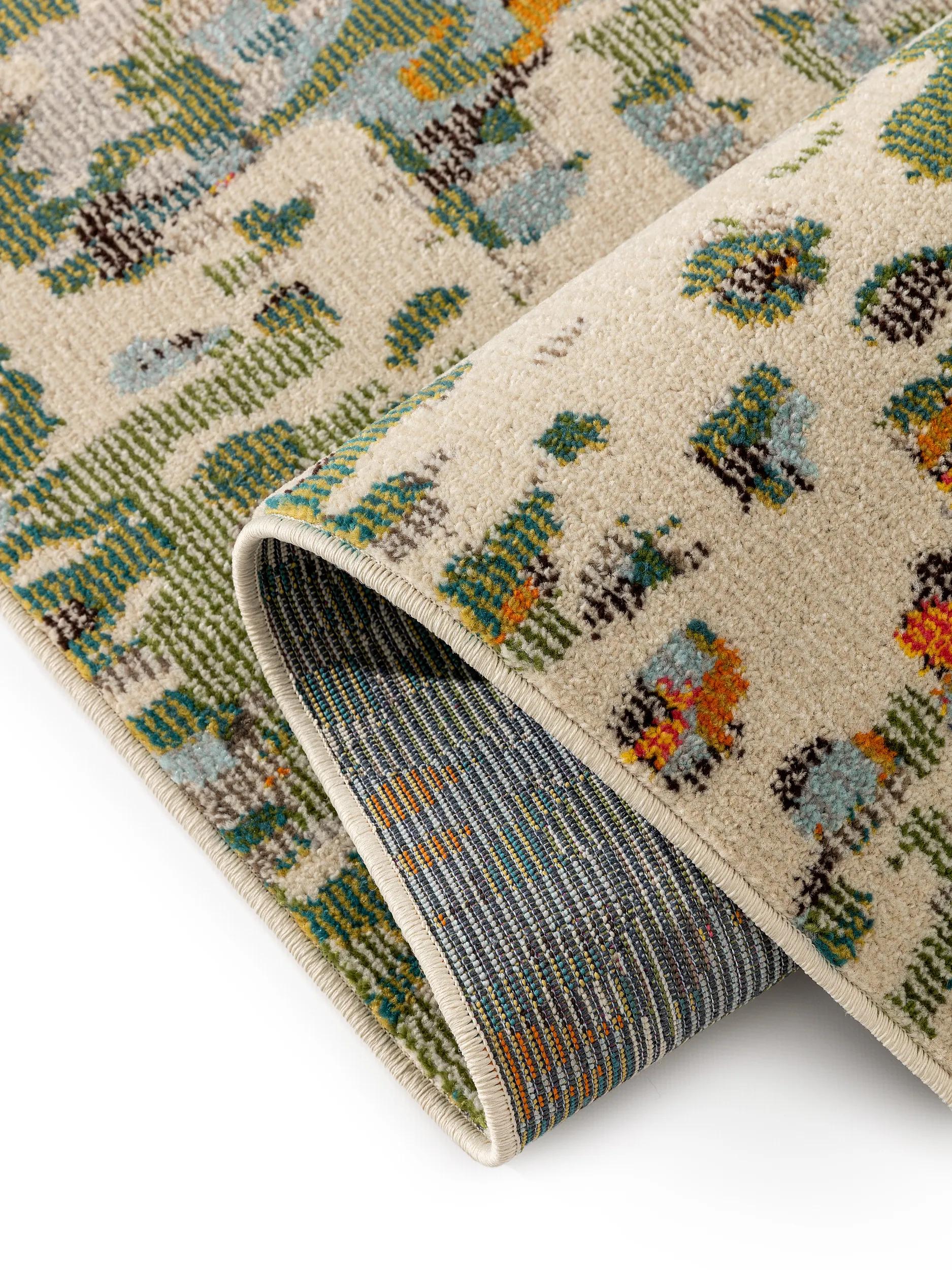 Les accords chromatiques sont traités comme une réinterprétation moderne du motif multicolore, avec des variations subtiles et des dégradés qui dialoguent plutôt que de s'affronter. La palette, vivante mais tempérée, apporte une énergie lumineuse adaptée aussi bien au salon qu'à une chambre d'enfant, en conservant une élégance discrète. Les couleurs paraissent atténuées par des nuances intermédiaires, comme si le temps et la lumière les avaient doucement estompées pour mieux se fondre dans le décor.