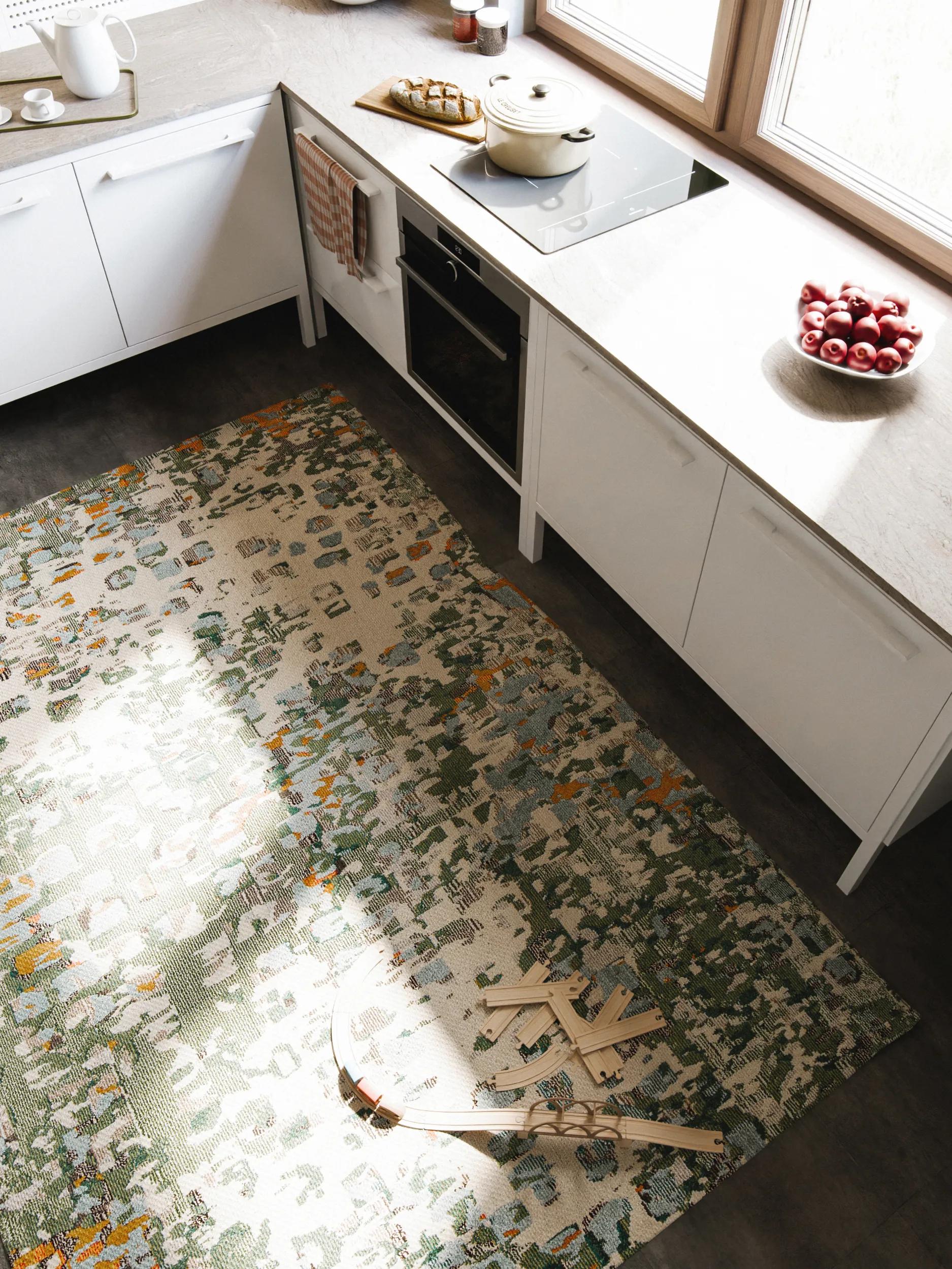 Pensé comme une pièce à part entière, ce modèle joue le rôle d'organisateur d'espace. Dans un salon il structure le mobilier, dans une chambre il définit l'aire de repos, et dans un coin enfant il crée un sol rassurant et coloré sans basculer dans la simple fantaisie. Le motif agit comme un fil conducteur, équilibrant formes et couleurs pour instaurer une lecture harmonieuse de la pièce.