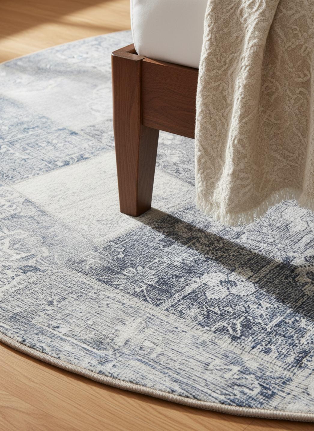 Tapis patchwork vintage rond bleu lavable 120 cm de diamètre