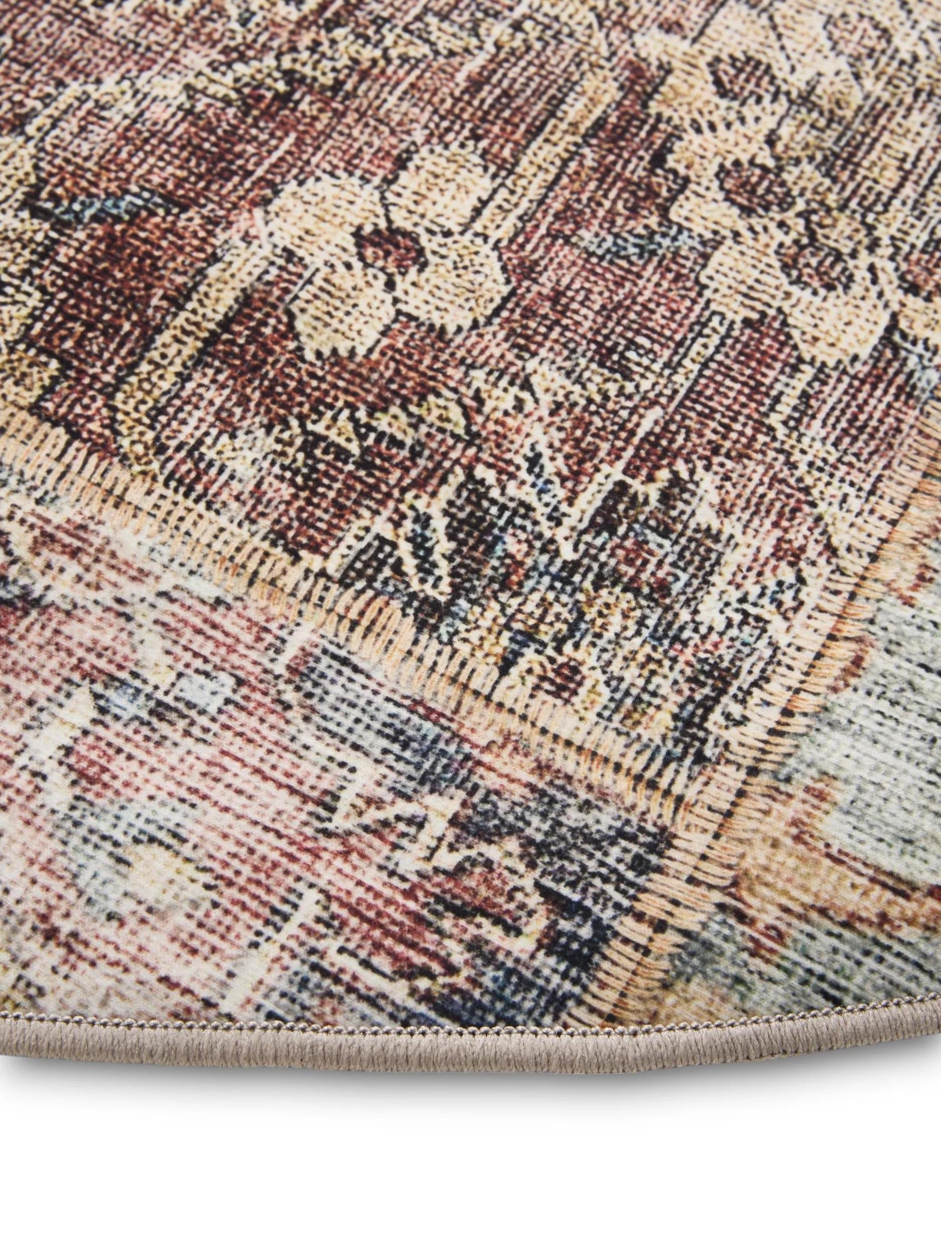 En pratique, la pièce de 120 cm de diamètre s'intègre facilement sous une table basse ou en point focal d'un coin lecture, et la mention lavable assure une utilisation sereine au quotidien, conjuguant esthétique et simplicité d'entretien sans sacrifier l'allure ancienne.