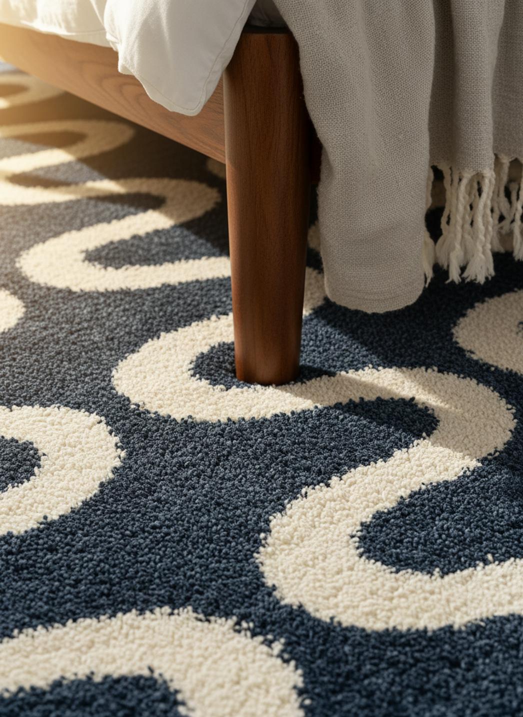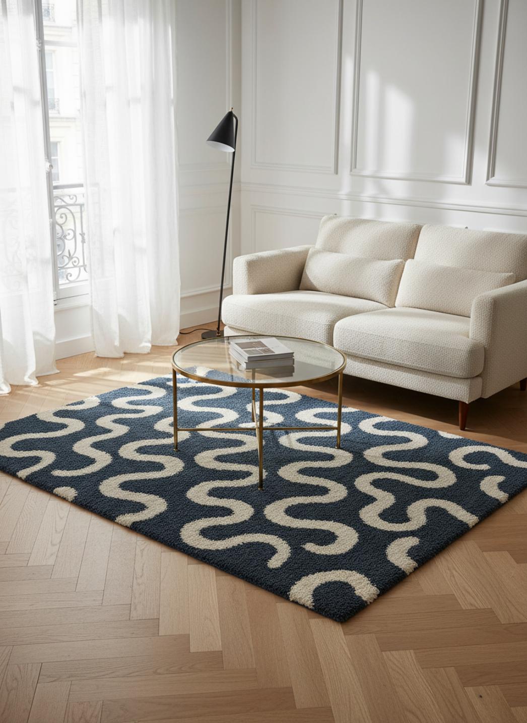 La pièce transforme immédiatement un salon contemporain ou une chambre graphique, faisant du tapis le centre graphique de la pièce et apportant un véritable équilibre des volumes; son impact visuel se lit comme un geste sculptural, capable de structurer une entrée stylisée, d'orienter un couloir vers une perspective ou d'ancrer un coin lecture sculptural.