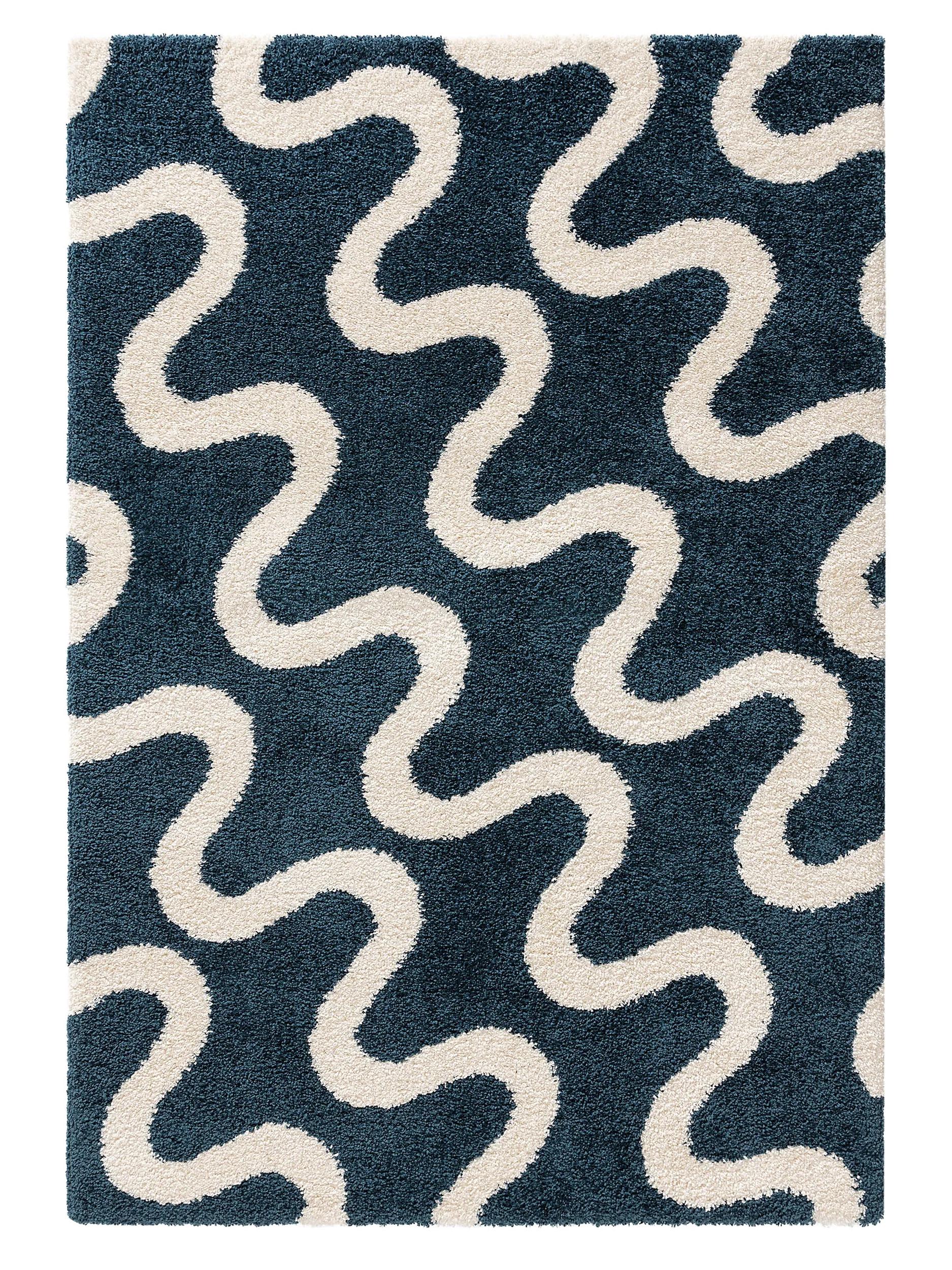 La conception révèle un remarquable jeu des courbes : arcs et vagues s'entrelacent avec des formes organiques et irrégulières, créant un contraste graphique maîtrisé et un impact visuel immédiat. Les compositions inspirées de l’art moderne se lisent en surfaces, avec des aplats bleu profonds ponctués de variations subtiles qui renforcent l'effet sculptural du format 200x290 cm.