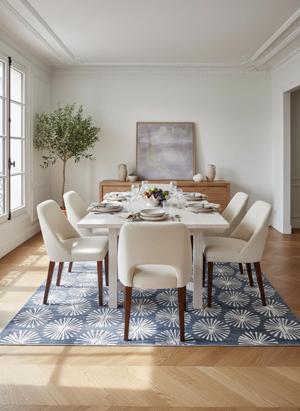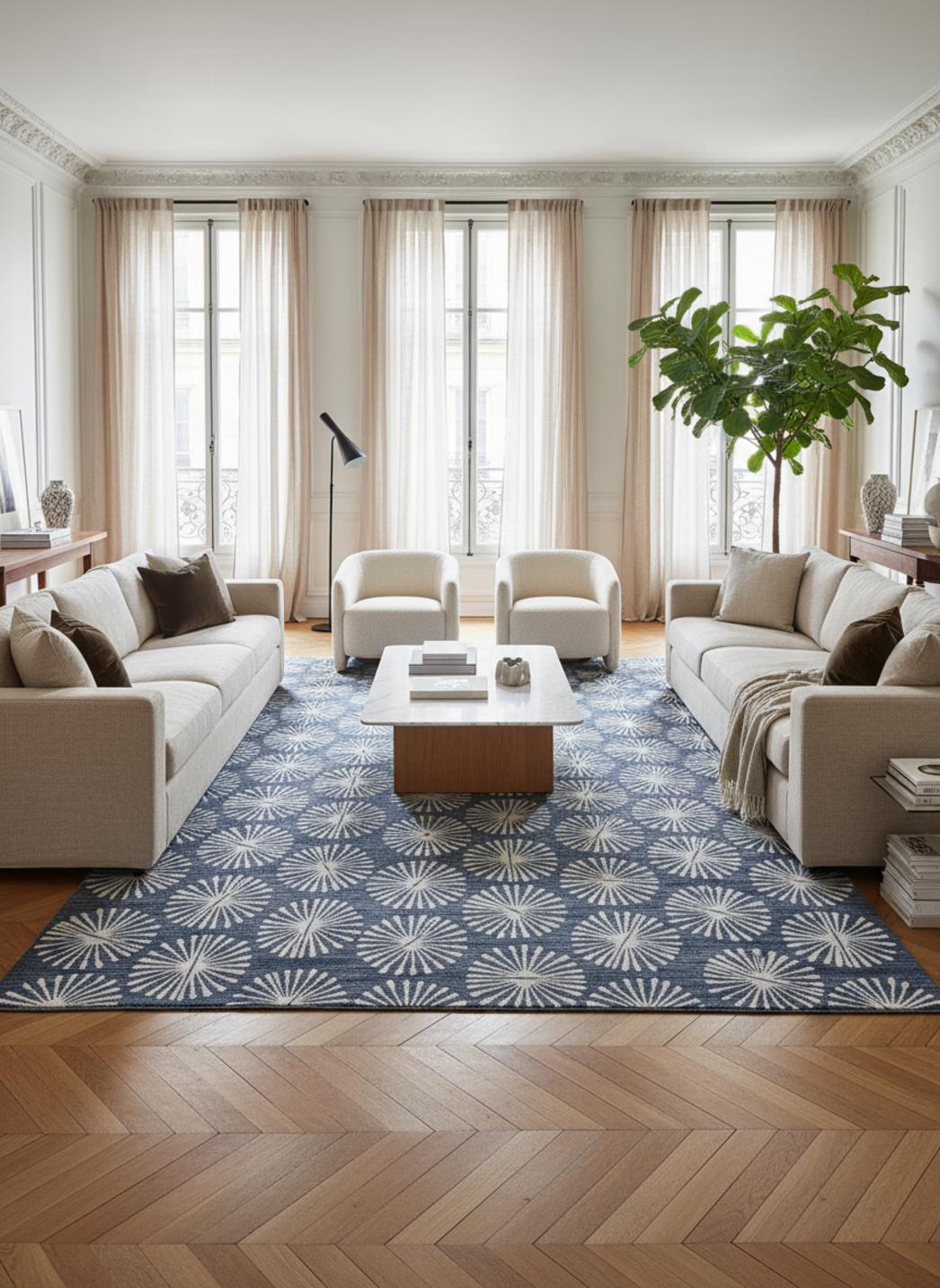 La palette joue le contraste maîtrisé entre bleu profond et blanc lumineux, un duo qui rappelle les tissus et les revêtements du mobilier d'époque tout en offrant une douceur visuelle actuelle. Les surfaces colorblock et les jeux de symétries simples structurent le motif, apportant à la fois rythme et sérénité, comme une fresque graphique suspendue au sol.