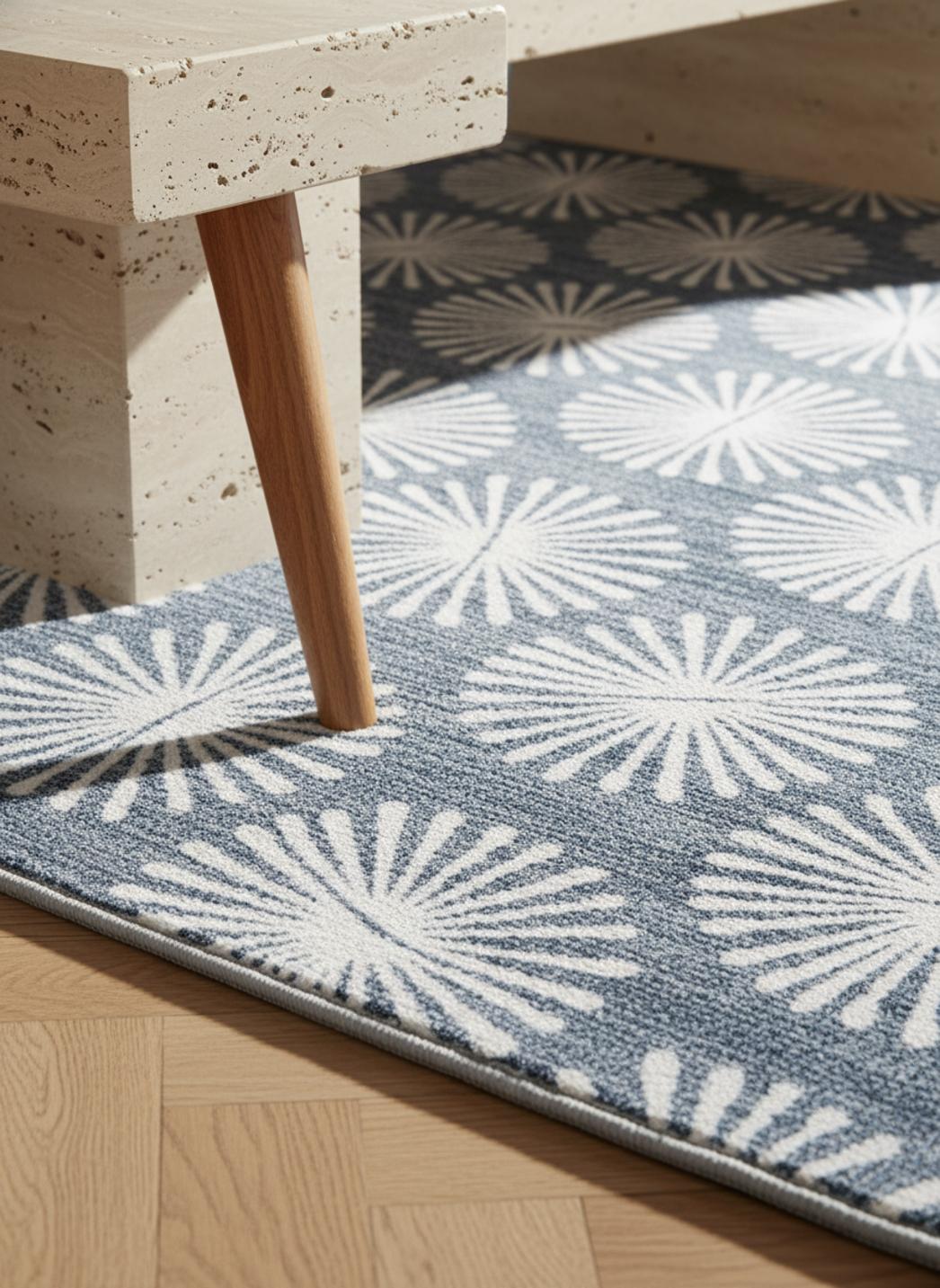 Sous un éclairage tamisé, ce tapis évoque une élégance doucement souvenir, ancrée dans l'esprit rétro et l'influence vintage des années 50–70, où les formes graphiques dialogue nt avec la nature. Le motif à fleurs se déploie comme une partition de courbes et d'arcs, mêlant cercles stylisés et vagues discrètes pour recréer cette gestuelle mid-century qui sait rester contemporaine.