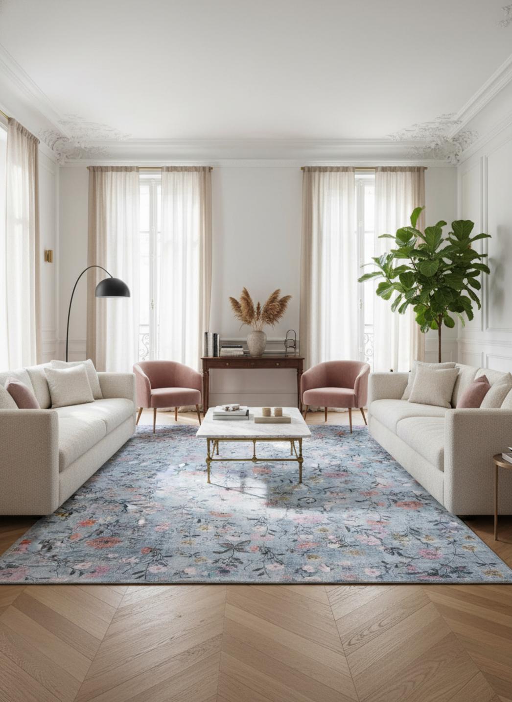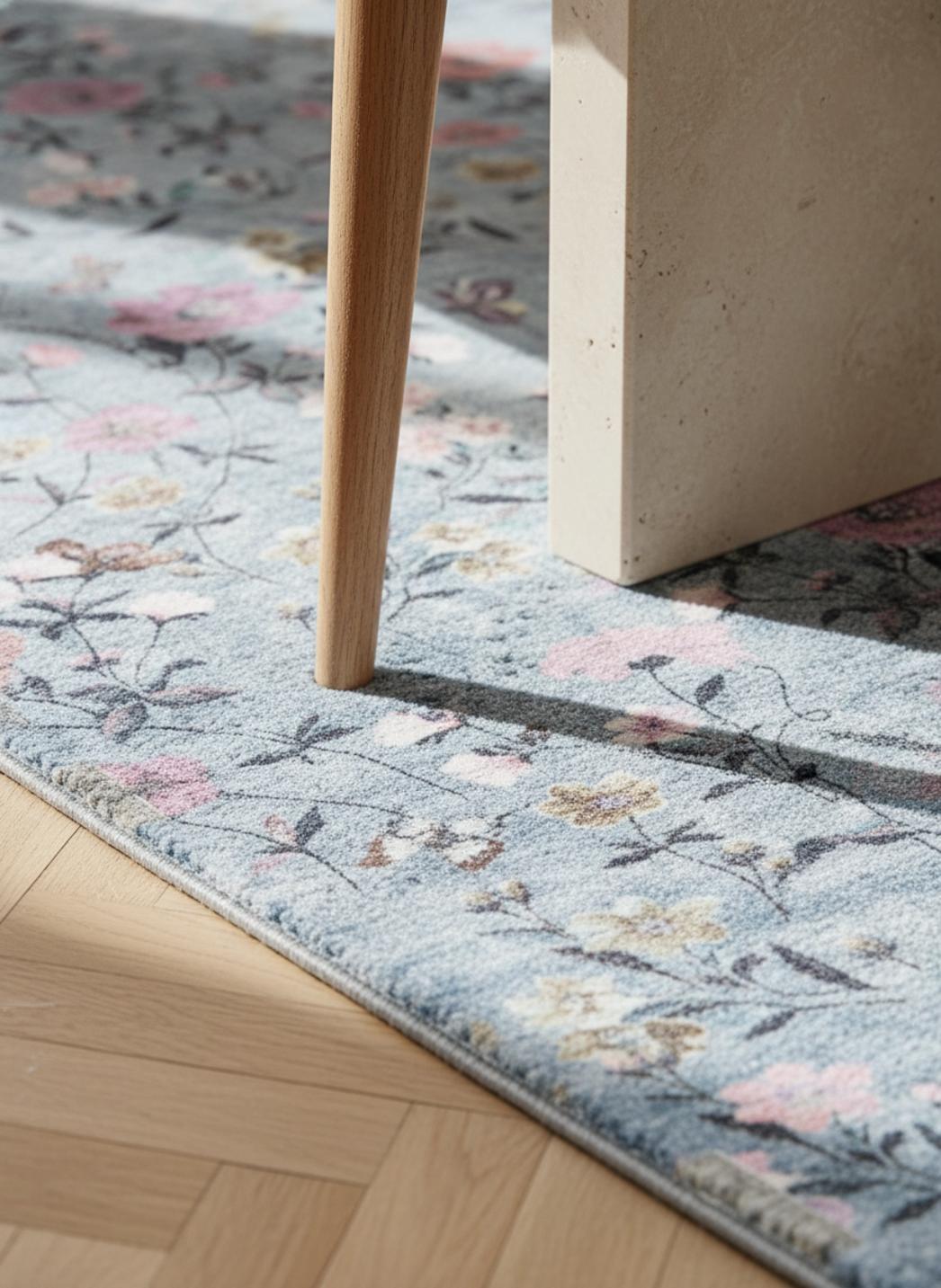 Sous une lumière tamisée, ce tapis incarne une élégance rétro où le motif à fleurs se réinvente en langage graphique : arcs doux, vagues et cercles qui rappellent les compositions des années 50–70. La palette joue la délicatesse, mariant un bleu profond à des touches de rose poudré, comme un hommage aux fauteuils et aux lampes mid-century, offrant une douceur visuelle immédiatement apaisante et singulièrement contemporaine.