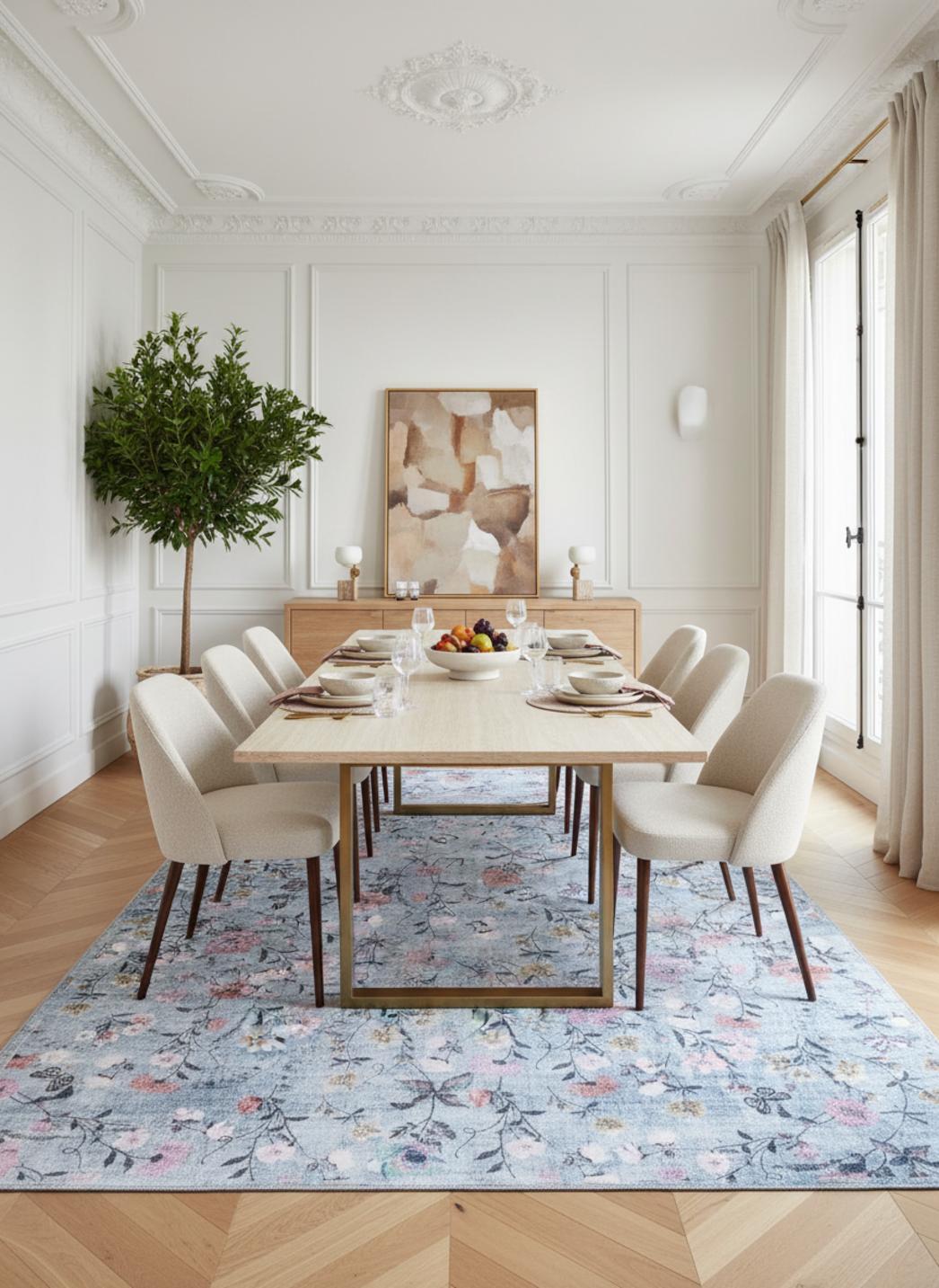 La dimension 200x300 cm impose une aura mesurée, capable d’unir canapés et fauteuils dans une structure vintage modernisée, tout en respectant l’équilibre des volumes. L’impact visuel s’exprime par une chaleur diffuse : la pièce gagne en intimité, la lumière glisse sur les motifs et souligne la modernité sourde du dessin floral, parfait pour un salon rétro chic, une chambre vintage ou un coin lecture cosy inspiré du mid-century modern.