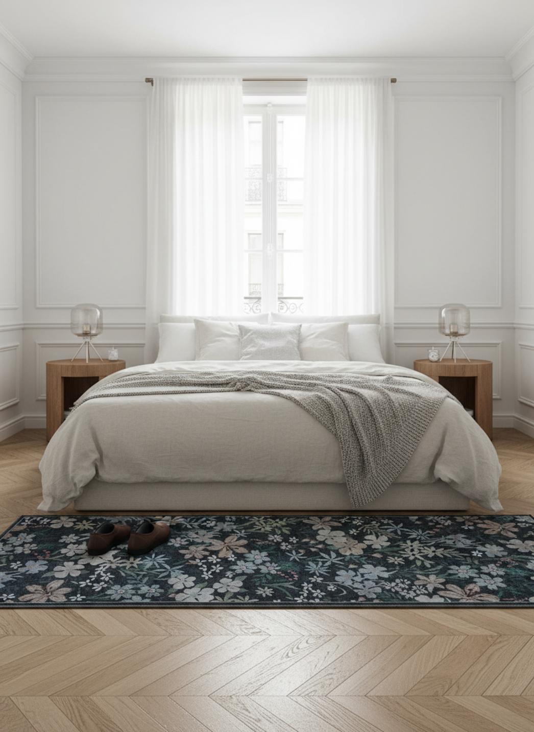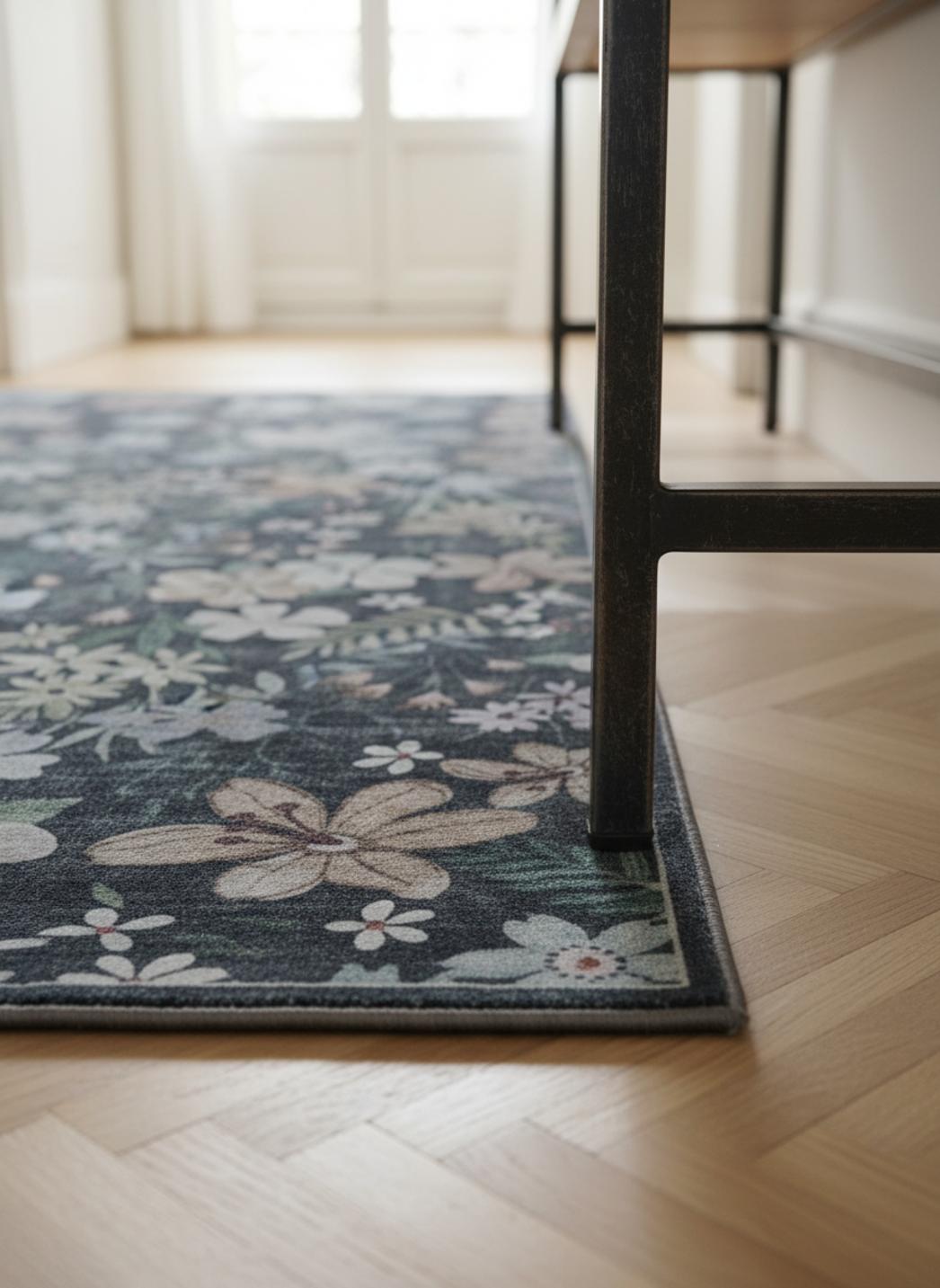 Sous une lumière douce, ce tapis évoque une élégance patinée qui respire l'esprit rétro tout en se faisant discrètement contemporaine, parée d'un motif délicat où de petites fleurs graphiques dialoguent avec des zones de contraste en noir et touches multicolore. L'influence vintage des années 50 à 70 se lit dans la palette et la composition : courbes amples, arcs et vagues qui rappellent le mobilier mid-century et des symétries simples mêlant formes organiques et colorblock.