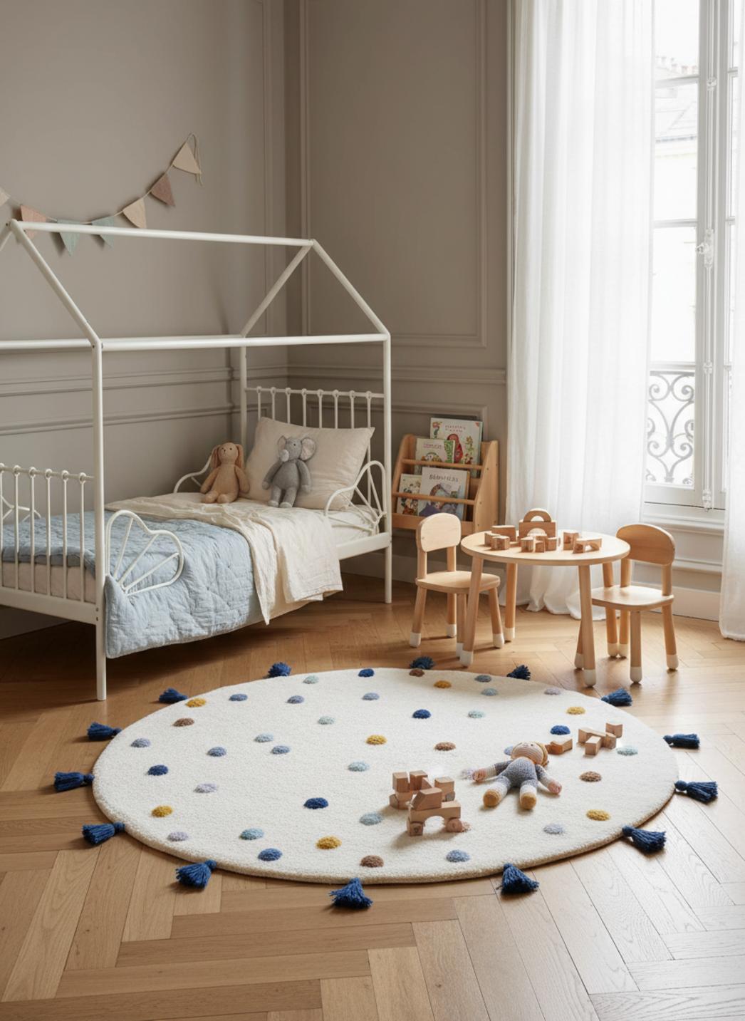 Dans la lumière du soir, le contraste bleu et blanc s'harmonise avec une palette de meubles clairs et des textures en bois, transformant un coin lecture en un véritable cocon où les histoires prennent vie. Les franges délicates encadrent l'espace comme une étreinte douce, rappelant un berceau chaleureux où l'enfant peut se lover pour une sieste improvisée.