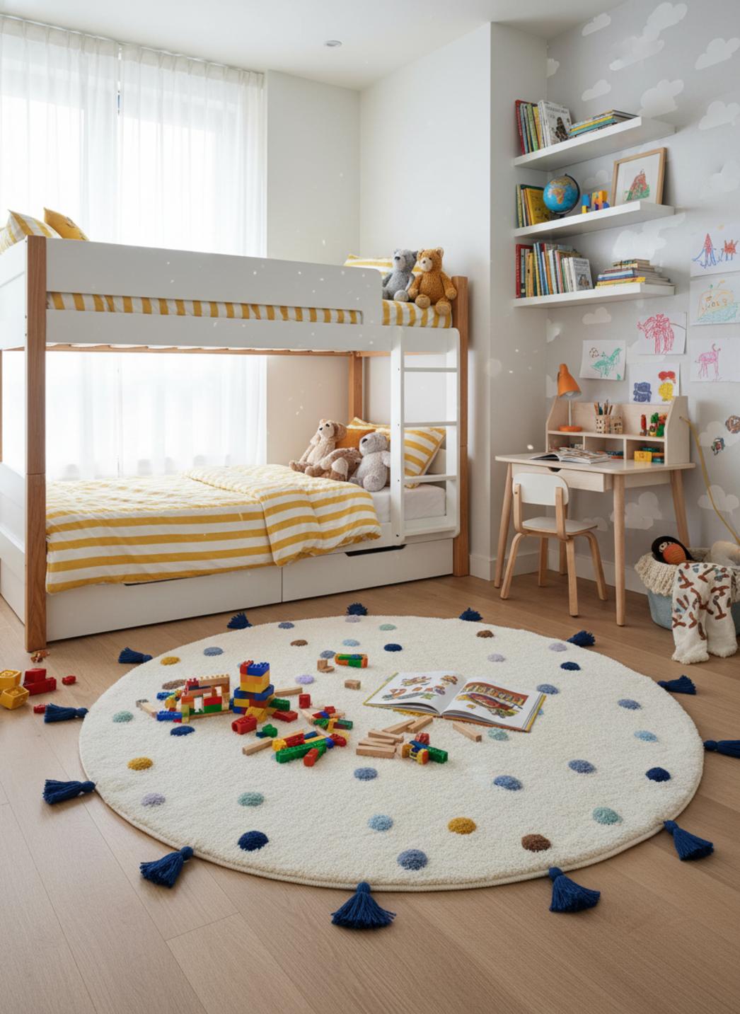 Imaginez une matinée douce où le soleil filtre à travers les rideaux et dessine des halos de lumière sur le sol : votre enfant s'installe pour une lecture câline ou un jeu tranquille, les jouets disposés autour d'un tapis qui invite à la pause. Le design scandinave apporte une simplicité apaisante à la chambre, avec des motifs discrets qui stimulent l'imaginaire sans surcharger l'espace.