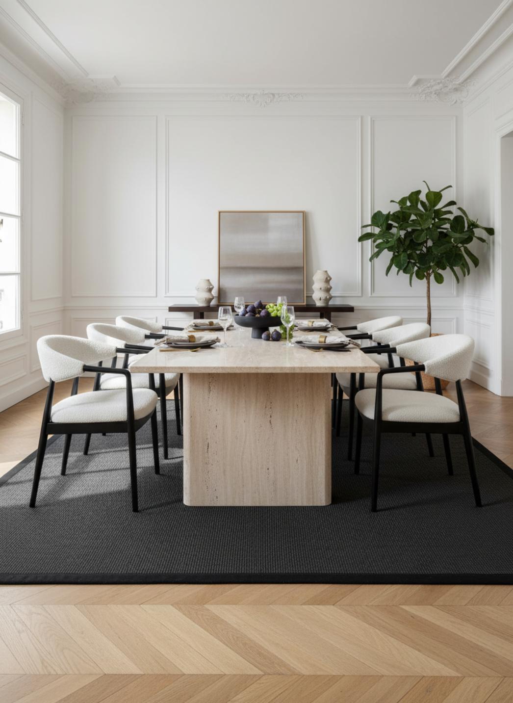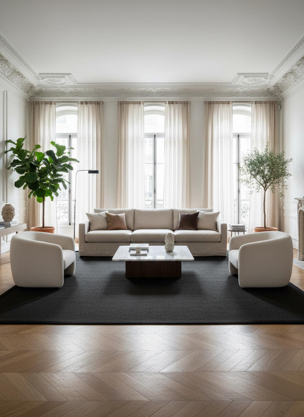 Le choix du noir se fait ici comme un geste graphique, un contraste élégant qui souligne la clarté des sols en bois clair et les textiles en lin, tout en apportant une profondeur visuelle subtile et contemporaine.