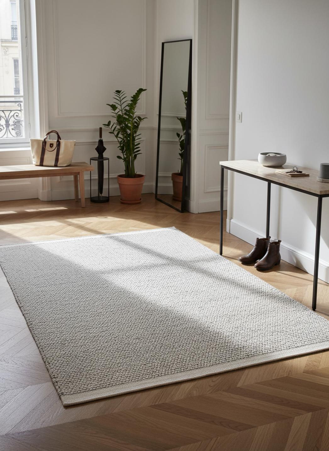 Pensée pour adoucir une chambre lumineuse ou structurer un bureau épuré, cette pièce rectangulaire met en valeur la simplicité fonctionnelle tout en offrant une sensation de cocon. Sa taille permet de délimiter une aire de repos ou d'accueil, et la chaleur de la laine confère un geste protecteur, calme et contemporain au sol.