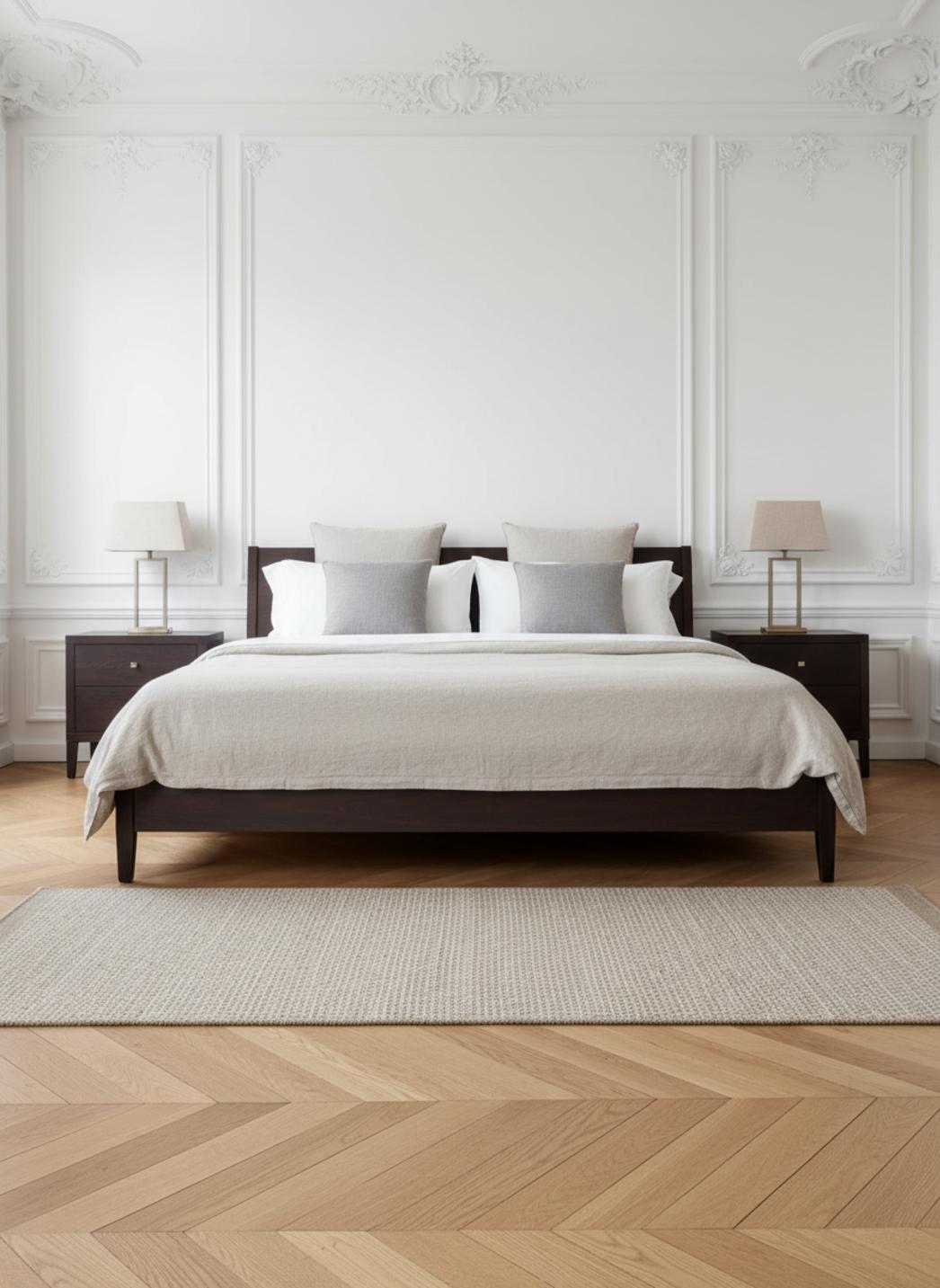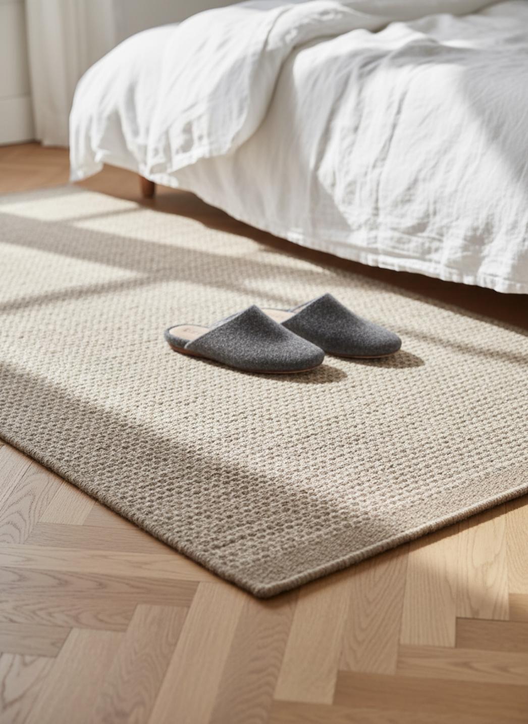 Pensée pour structurer une chambre étroite, la forme de descente de lit s’intègre avec justesse et proportion : les dimensions 80x250 cm recentrent l’espace, définissent un chemin doux et accompagnent un mobilier léger, apportant à la fois confort et perspective.