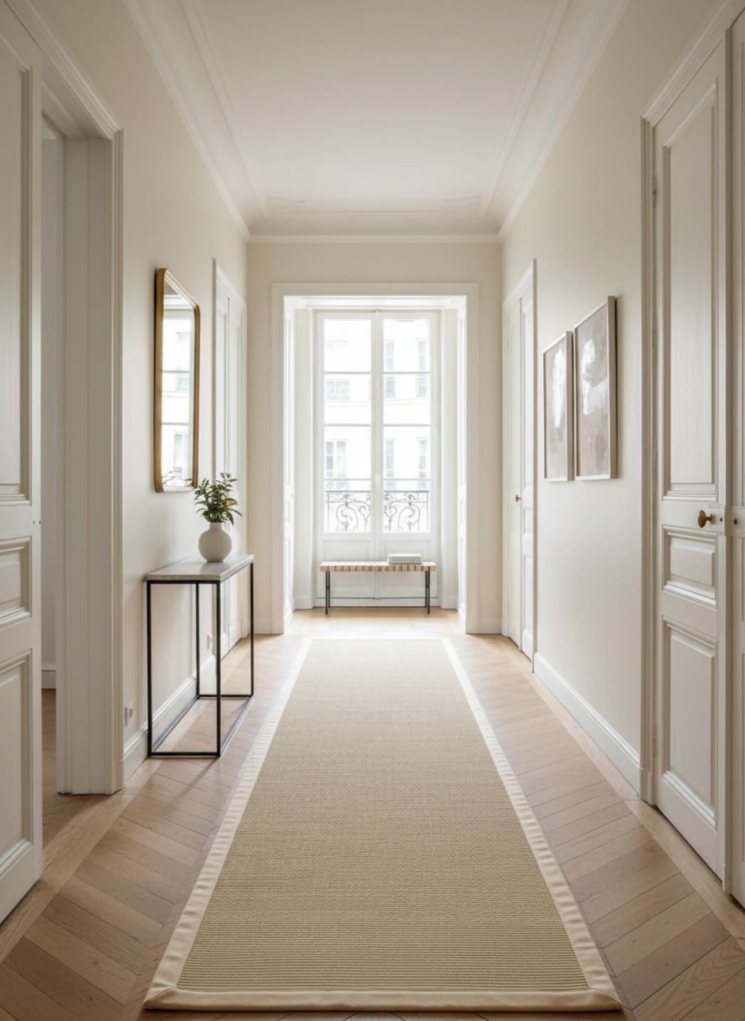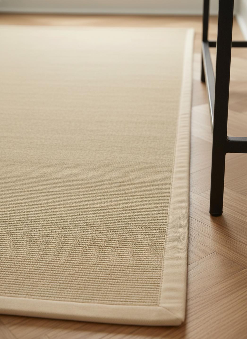La structure naturelle du sisal apporte une matière authentique et texturée, généreuse sans être ostentatoire, qui invite au toucher discret. Cette fibre confère au tapis une robustesse et une élégance brute, subtilement tempérée par une finition soignée qui adoucit la marche et le regard.