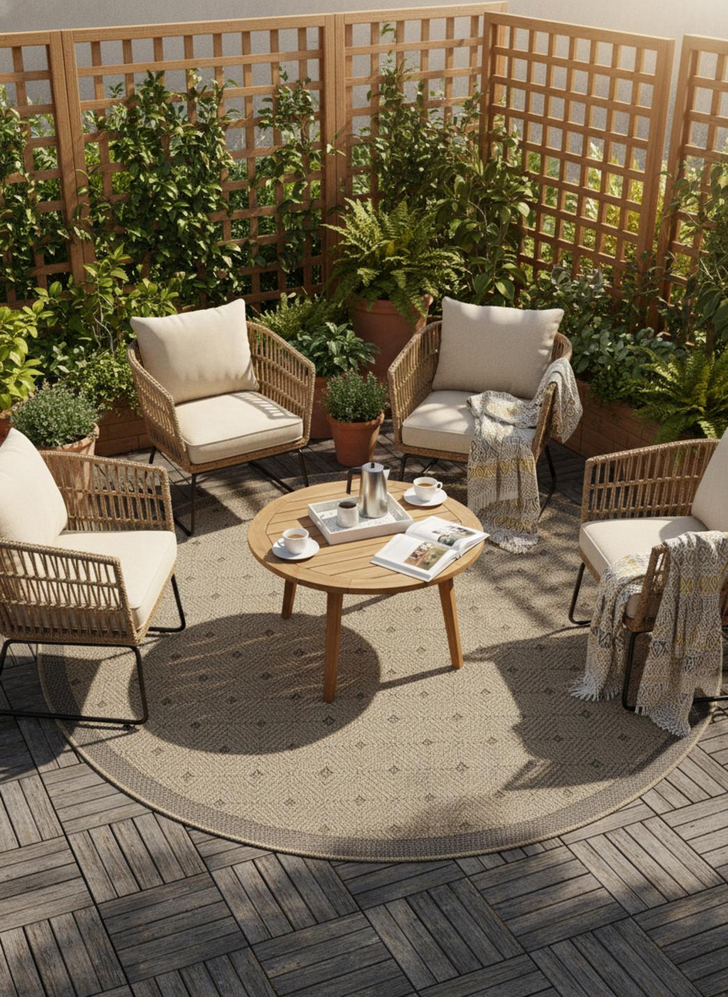 Avec son motif à points délicatement rythmé et sa forme ronde, ce tapis scandinave diffuse une atmosphère douce et équilibrée. Sa teinte marron naturel évoque la chaleur du bois et les nuances de la terre, apportant une touche organique et apaisante aux espaces extérieurs. La simplicité de son dessin ponctué de petits cercles crée un jeu visuel léger, parfait pour structurer un coin repas, un espace détente ou une terrasse de style nordique. Sa forme circulaire adoucit les lignes du mobilier et invite à la convivialité, tandis que sa texture fine capte la lumière avec subtilité. Placé sous une table ronde, un fauteuil en rotin ou près de plantes vertes, il crée un lien harmonieux entre nature et design. Ce modèle s’inscrit pleinement dans la collection de tapis d’extérieur, conçue pour faire dialoguer confort et esthétisme en plein air. Pour prolonger cette harmonie douce et épurée, laissez-vous inspirer par notre sélection de tapis d’extérieur ronds. Un tapis au charme naturel et minimaliste, qui transforme chaque espace en cocon apaisant et lumineux.