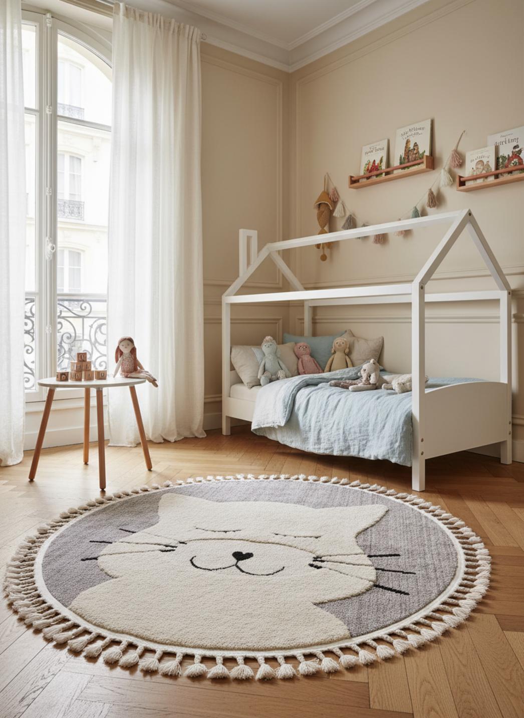 La présence d'un petit motif tout en tendresse, un chat esquissé, stimule l'imaginaire sans surcharger la chambre : il devient compagnon de contes, point d'attention pour les tout-petits et détail affectueux qui fait sourire chaque matin. Pensé pour l'enfant, ce tapis est doux au toucher, avec une épaisseur qui amortit les chutes, assure la stabilité des premiers pas et invite aux longues heures de concentration au sol.