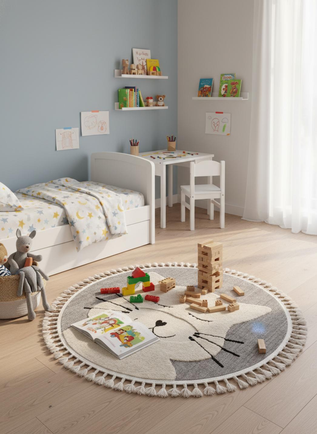 Enfin, la matière choisie allie douceur et résistance, offrant un contact chaleureux, un amorti confortable et une excellente tenue au quotidien ; le tissage sécurisé facilite l'entretien, résiste aux petites aventures et se nettoie facilement pour préserver l'hygiène de la chambre. Ce tapis devient vite le point de rassemblement familier où se tissent routines et souvenirs, lumière tamisée et rires partagés.