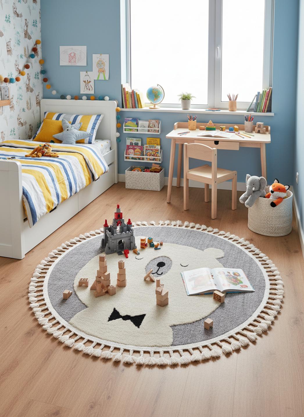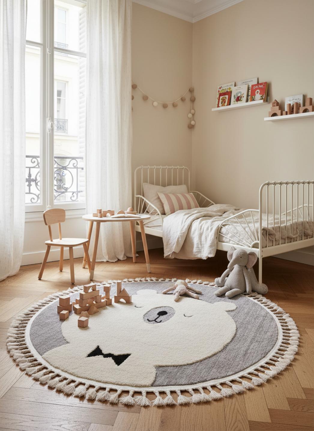 Pour imaginer l’assemblage complet de la chambre et découvrir d’autres modèles pensés pour les routines, les siestes et les explorations, parcourez notre collection complète de tapis pour enfants et trouvez le compagnon de rêve pour les premières années de votre petit. Le modèle en enfant de 120 cm de diamètre s’insère naturellement dans un coin lecture, une aire de jeu ou au centre de la chambre, prêt à créer des souvenirs doux et durables.