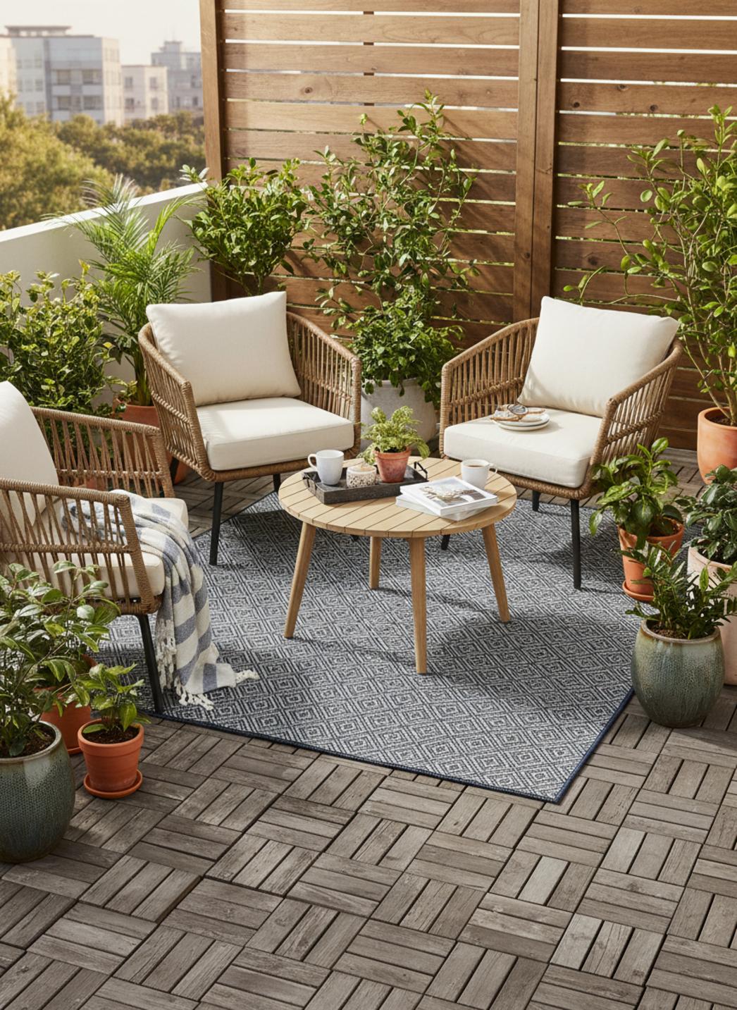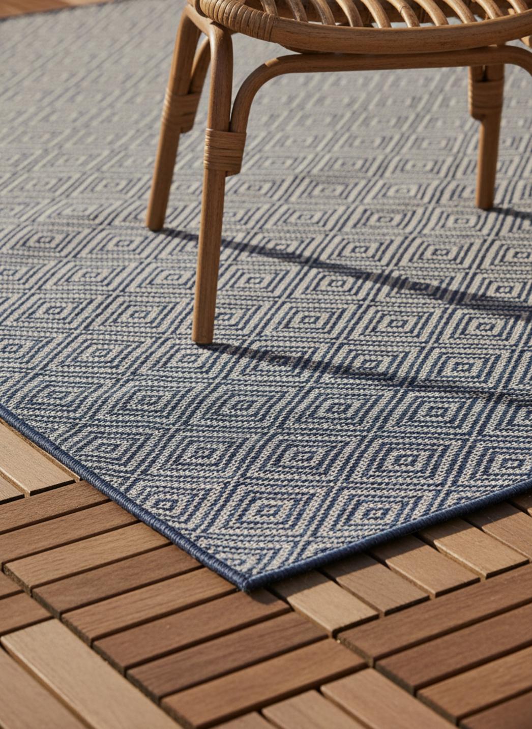 À la lumière claire d’un matin sur la terrasse, ce tapis scandinave se distingue par la délicatesse de son motif losange bleu, sobre et apaisant. Ses lignes géométriques, régulières et légères, insufflent une impression d’ordre tranquille tout en conservant la douceur caractéristique du style nordique. Le bleu, à la fois frais et profond, évoque le calme des paysages marins et la pureté de l’air du grand nord. Par son format 80x150 cm, il s’intègre naturellement dans les espaces plus intimes : devant une baie vitrée, sous une petite table d’extérieur ou le long d’un balcon. Sa texture discrète capte la lumière et en révèle de fines nuances, donnant une sensation de matière vivante et de confort visuel. Ce tapis bleu se marie aisément avec les bois clairs, le rotin ou les tons neutres, créant un équilibre subtil entre modernité et naturel. Il transforme les petits extérieurs en coins de détente sereins, où la simplicité devient synonyme de raffinement. Un souffle d’harmonie, léger et lumineux, pour habiller les instants de calme à ciel ouvert.
