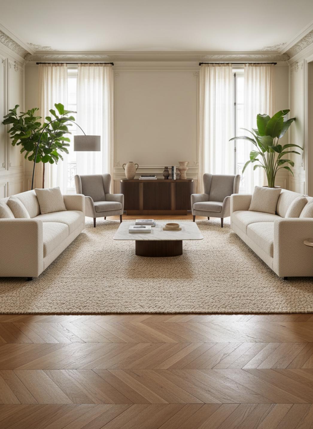 Dans une pièce baignée de lumière naturelle, la silhouette épurée du salon se révèle subtilement grâce à une nuance douce de scandinave pensée pour apaiser le regard et amplifier l’air. La palette claire trouve son centre dans un ton beige délicat, qui capte la clarté sans la dominer, offrant une sensation d’espace et de calme.